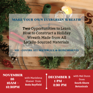 Join Mel Dunn from South Shore Botanicals for an afternoon workshop. Learn how to design your own natural wreath with