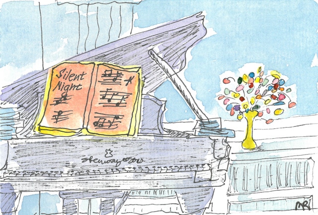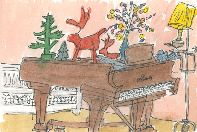 I call my business “The Illustrated Life” because I carry a little watercolor book with a fine-tipped ink pen in my pocket, and whip them both out when something strikes my fancy: beauty, whimsy, the backs off people’s heads in a concert or a meeting, or a space with challenging angles (buildings and interiors) and strong colors. (the deep orange/red of “Inga’s Room” in this year’s calendar is my favorite color. I am both dog and butterfly - one drools, the other flits about. Contradictory, n”est-ce pas? I draw small, but I love all my drawings. They make me happy and more expansive. As someone who has journaled most of her life, it has also taken a long time for me tl move to drawing as my primary way of communication. but drawing is so different from writing. I generally go into a zone when I draw, trying to translate a 3-dimensional visual reality onto a 2-dimensional flat page.I approach this challenge with a beginner’s mind which goes something like this: “Well I have no idea what I’m doing here, but let’s see what I can learn from myself.”