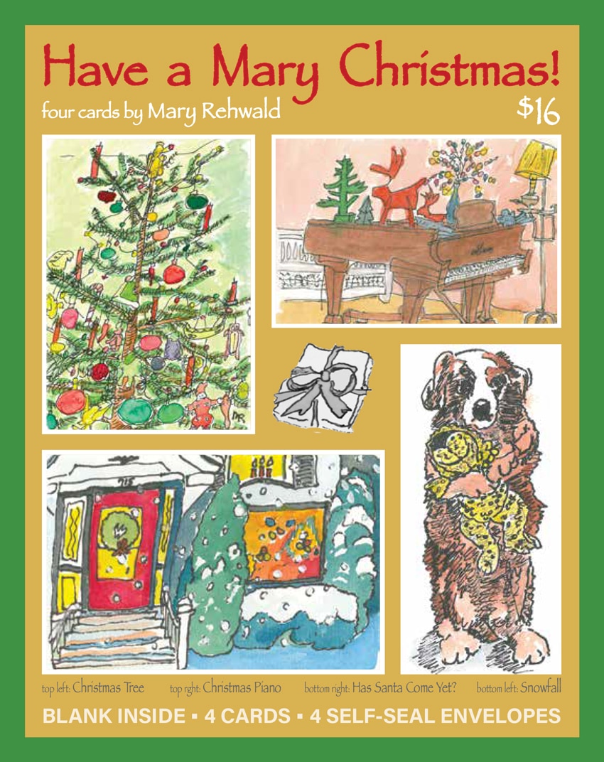 This special four-pack of 5 x 7 greeting cards (blank inside) and 4 self-seal envelopes features four of Mary’s wonderful & whimsical holiday-themed illustrations.