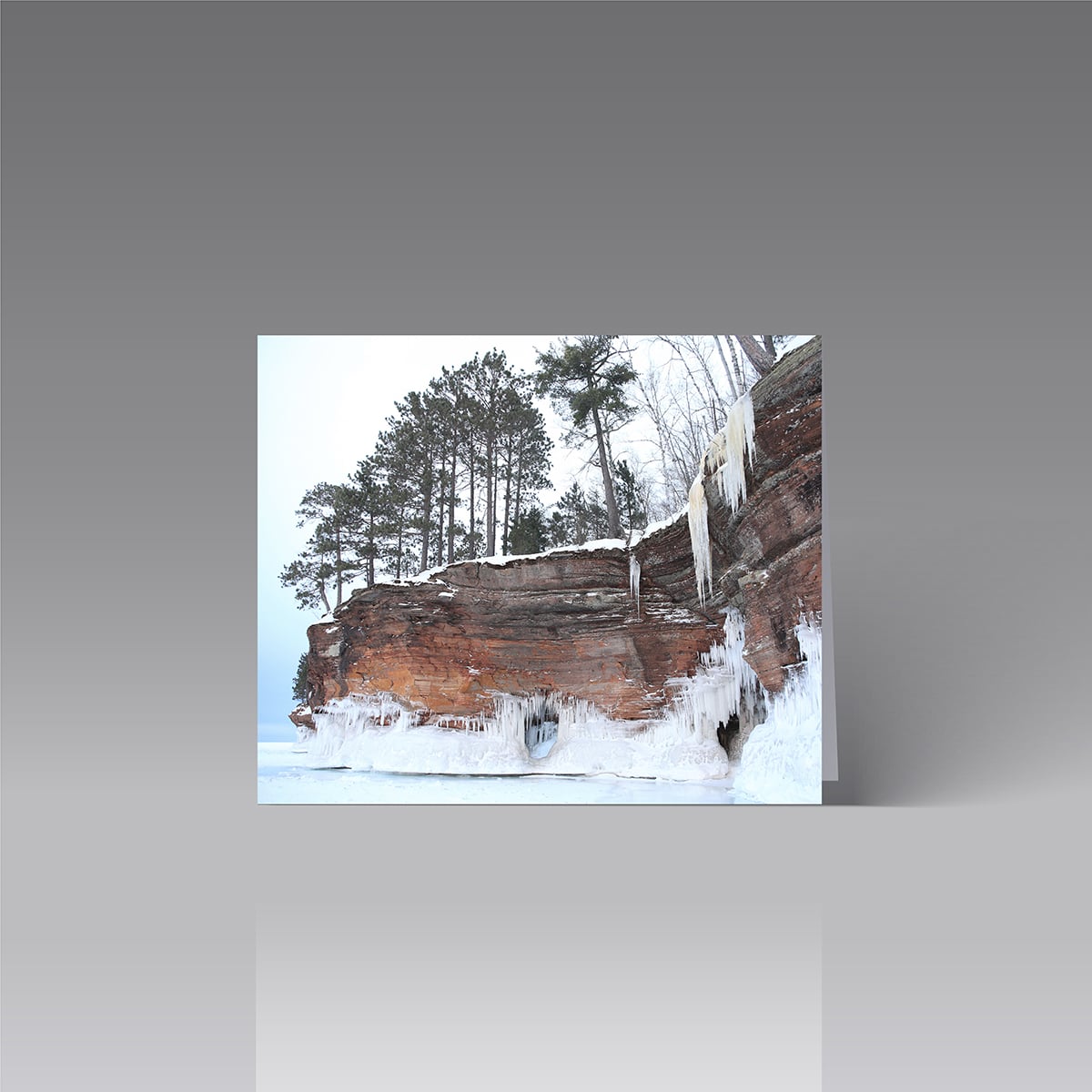 Instead of purchasing individual cards, save 20% by selecting this pack of eight 5” x 7” cards (blank inside). Images are from Catherine Lange’s series of Ice Caves photos taken during a very frigid January in 2014. Nearly 90 percent of Lake Superior froze that season, and the ice caves became accessible. The Lake Superior Ice Caves are located in the Apostle Islands National Lakeshore at Mawikwe Bay along the mainland. When the lake freezes, people can make the two-mile-long round-trip hike across the ice to see the caves, and during that season almost 140,000 people traveled from around the world to do that. Frozen waterfalls formed pillars of ice on the red cliffs. Icicles adorned cliff edges and the domed ceilings of caves.