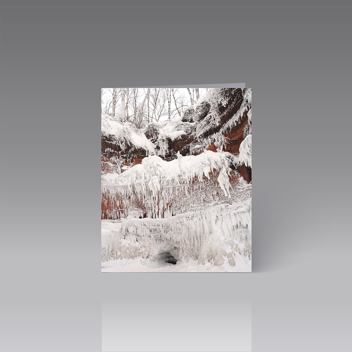 Instead of purchasing individual cards, save 20% by selecting this pack of eight 5” x 7” cards (blank inside). Images are from Catherine Lange’s series of Ice Caves photos taken during a very frigid January in 2014. Nearly 90 percent of Lake Superior froze that season, and the ice caves became accessible. The Lake Superior Ice Caves are located in the Apostle Islands National Lakeshore at Mawikwe Bay along the mainland. When the lake freezes, people can make the two-mile-long round-trip hike across the ice to see the caves, and during that season almost 140,000 people traveled from around the world to do that. Frozen waterfalls formed pillars of ice on the red cliffs. Icicles adorned cliff edges and the domed ceilings of caves.