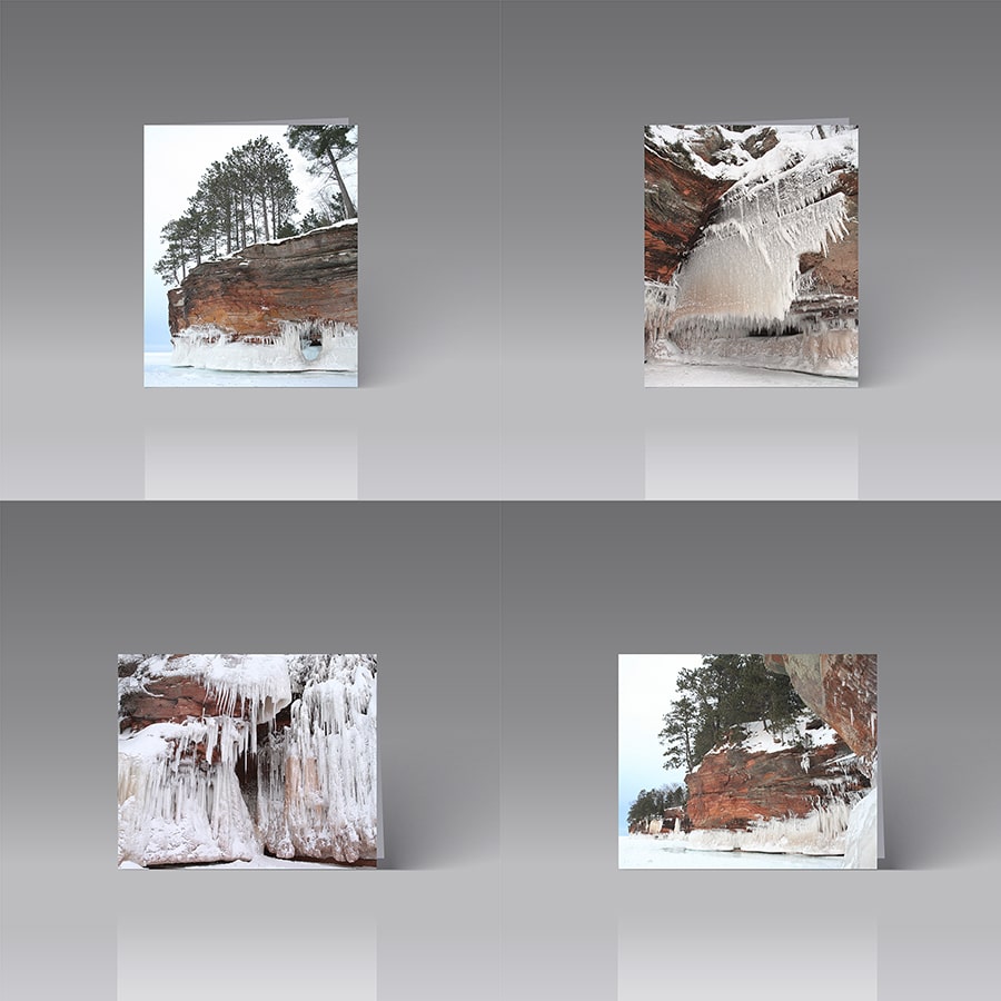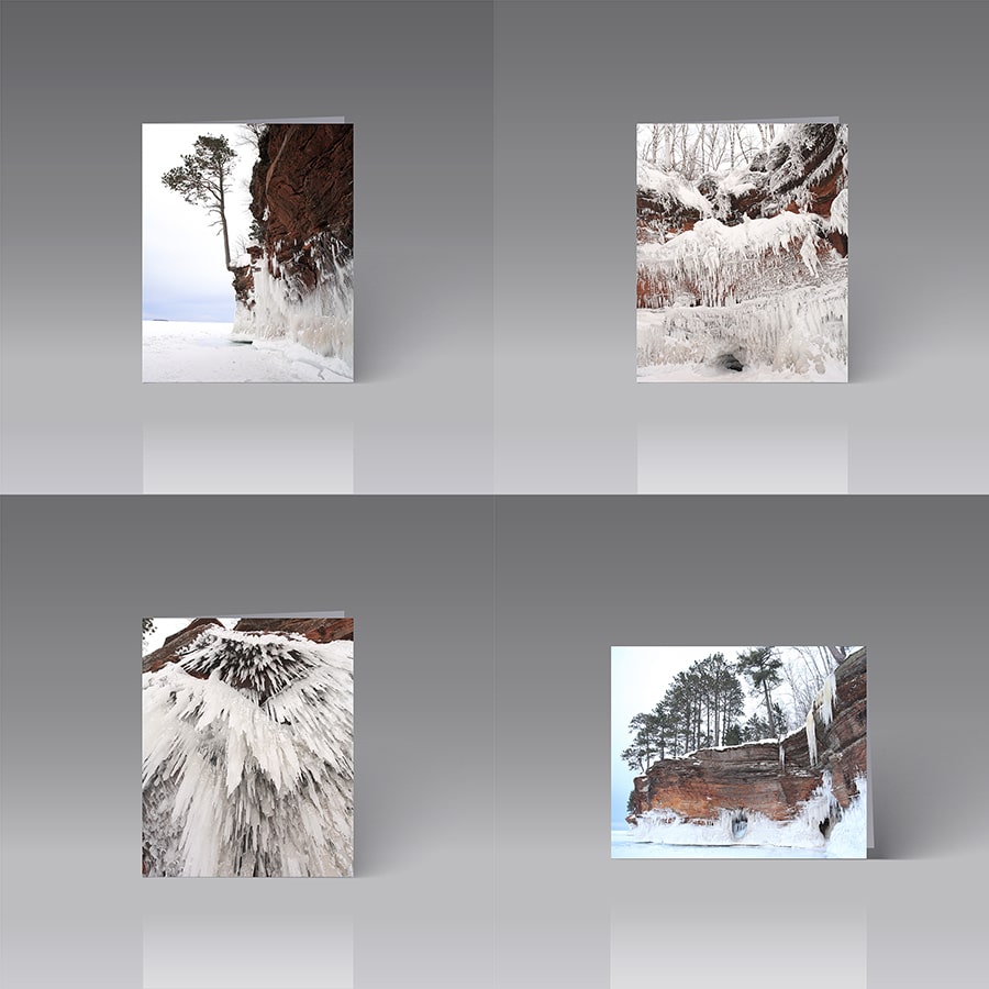 Instead of purchasing individual cards, save 20% by selecting this pack of eight 5” x 7” cards (blank inside). Images are from Catherine Lange’s series of Ice Caves photos taken during a very frigid January in 2014. Nearly 90 percent of Lake Superior froze that season, and the ice caves became accessible. The Lake Superior Ice Caves are located in the Apostle Islands National Lakeshore at Mawikwe Bay along the mainland. When the lake freezes, people can make the two-mile-long round-trip hike across the ice to see the caves, and during that season almost 140,000 people traveled from around the world to do that. Frozen waterfalls formed pillars of ice on the red cliffs. Icicles adorned cliff edges and the domed ceilings of caves.