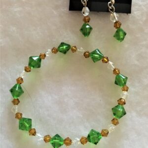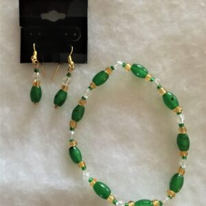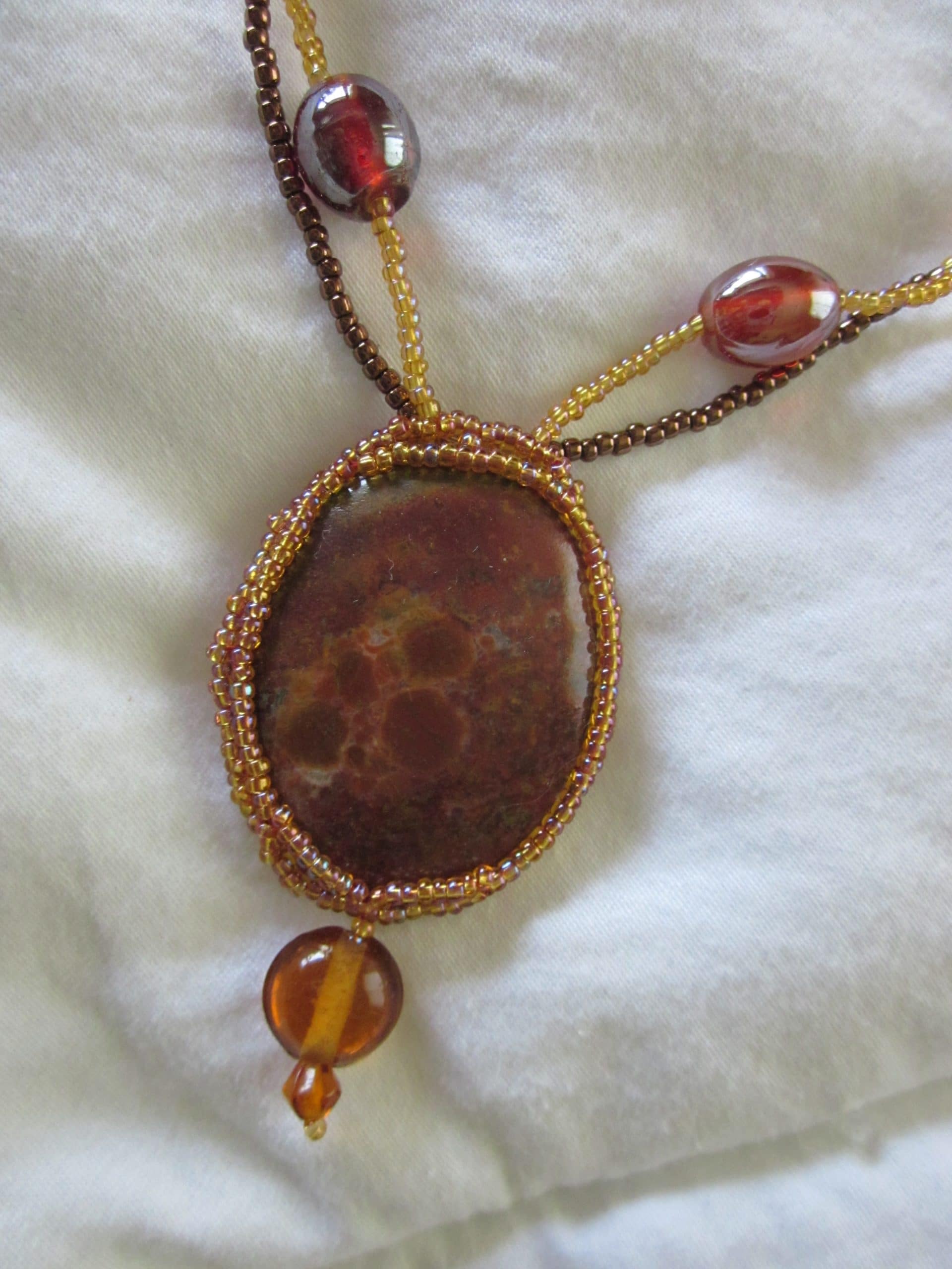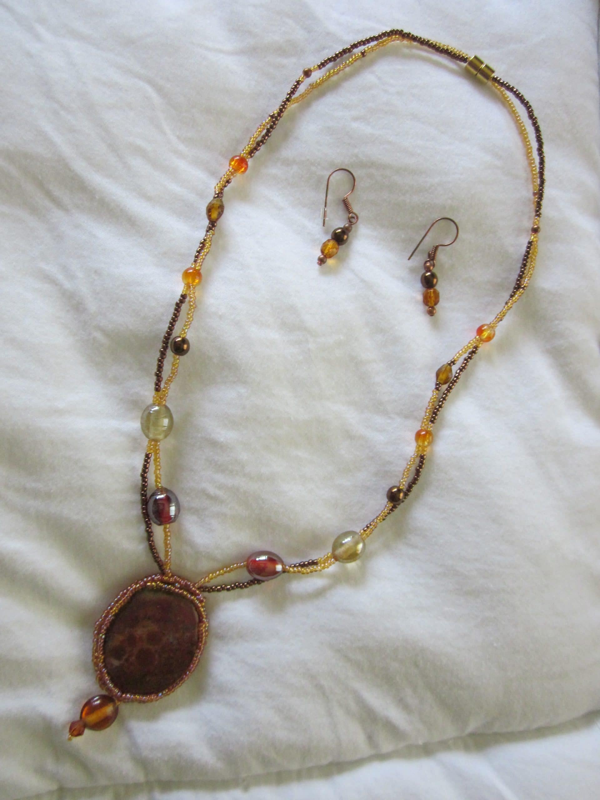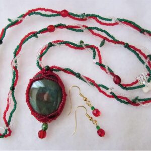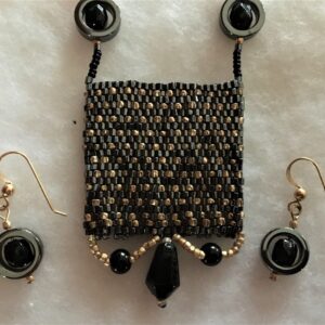 Eagle Eye Agate wrapped with hand woven glass seed beads & matching earrings with copper ear wires. Beaded chain is 19″ with gold tone magnet clasp. Agate is 2″ with embellishment.