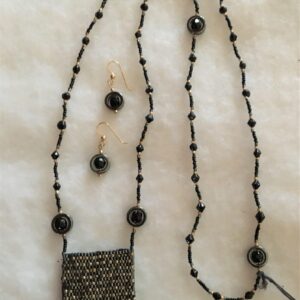 Black & Gold Beaded Amulet Pouch & Earrings Set
