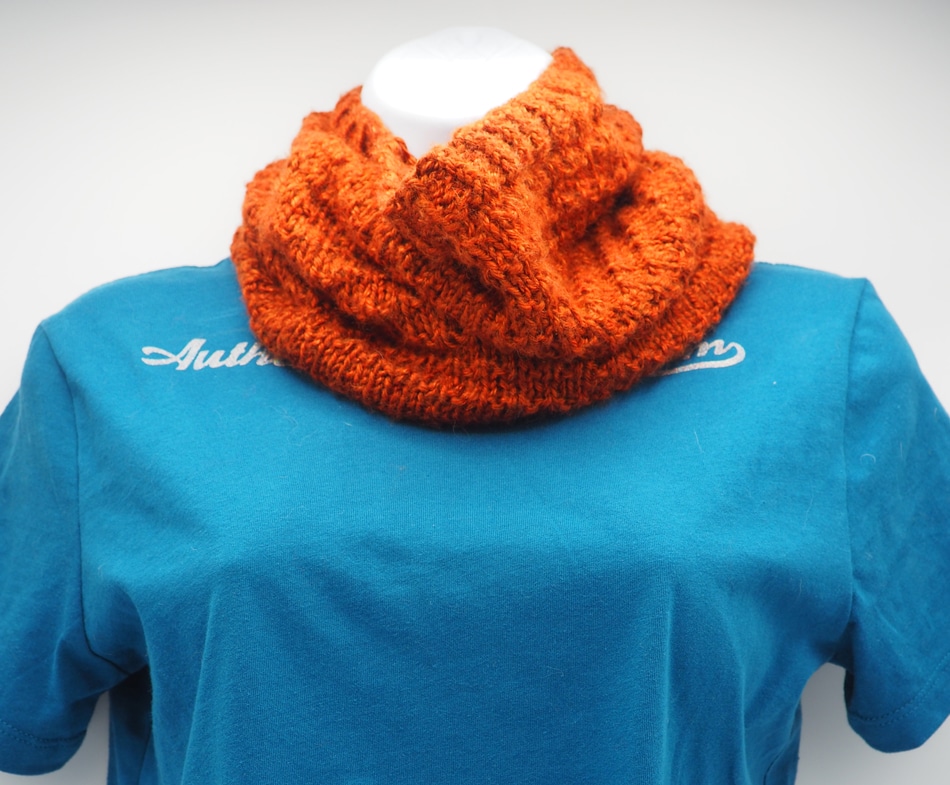 A close-fitting hand knit cowl. Keeps your neck warm without the extra bulk of most scarves or shawls. 7.5×10.5 in | Acrylic | Color options: Rugby, Cherry Red