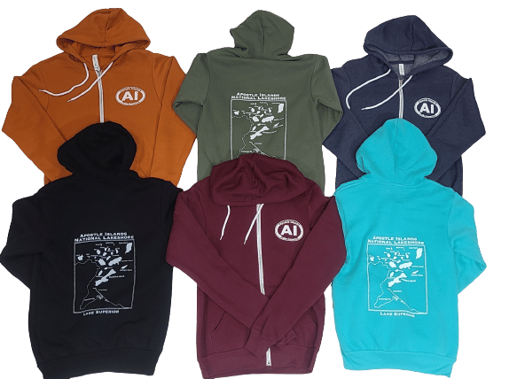 Ultra soft full zip-up, Apostle Islands AI hooded sweatshirt with pockets. AI logo on left front. Map of Apostle Islands on the back. A must have if you’ve ever visited the Apostle Islands! Super popular! Made of 52/48 airlume combed and ringspun cotton/polyester blend. Bella + Canvas brand.