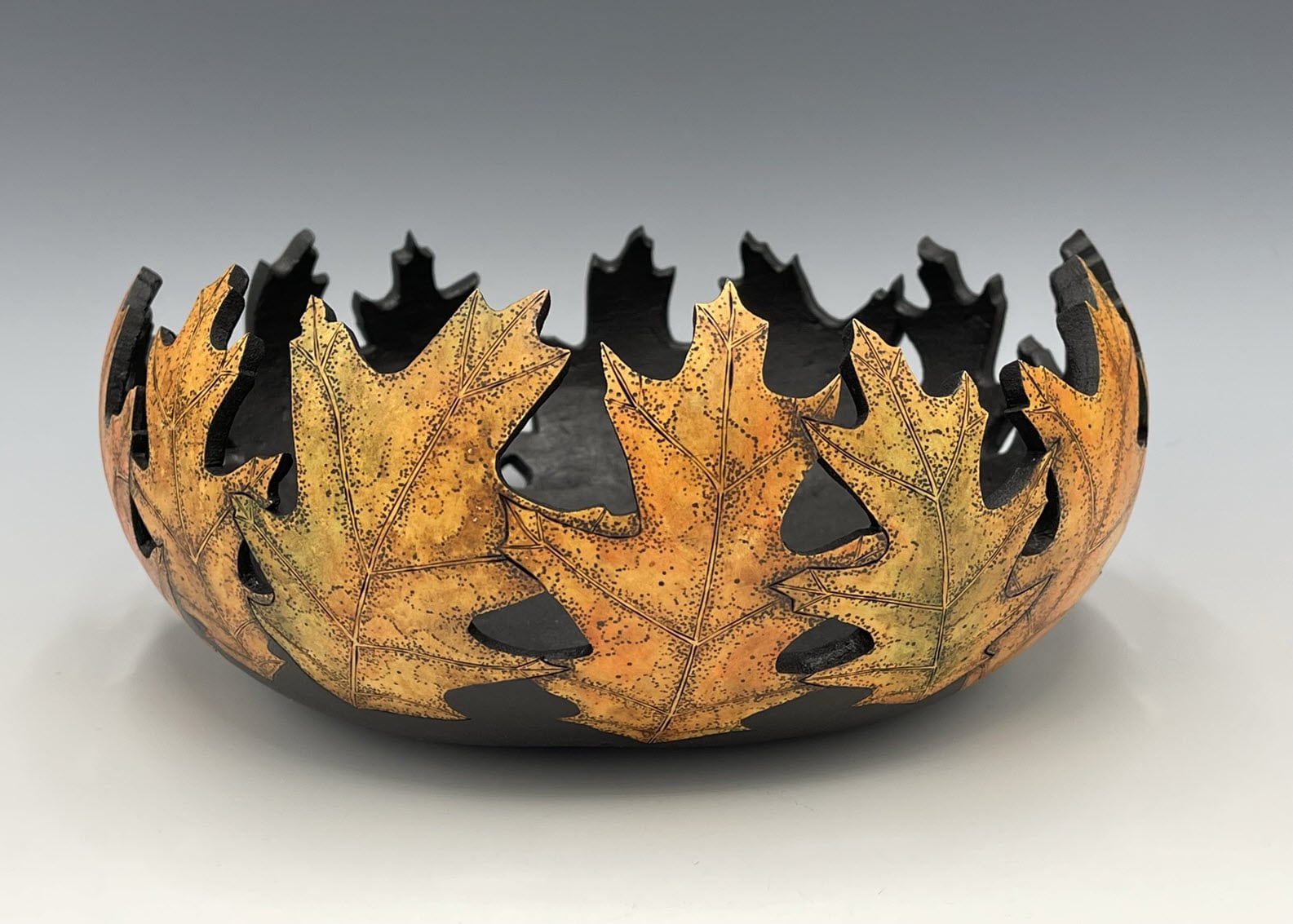 A thick-shelled gourd with intricately carved pyrographed leaves and finished with earth-tone oils.