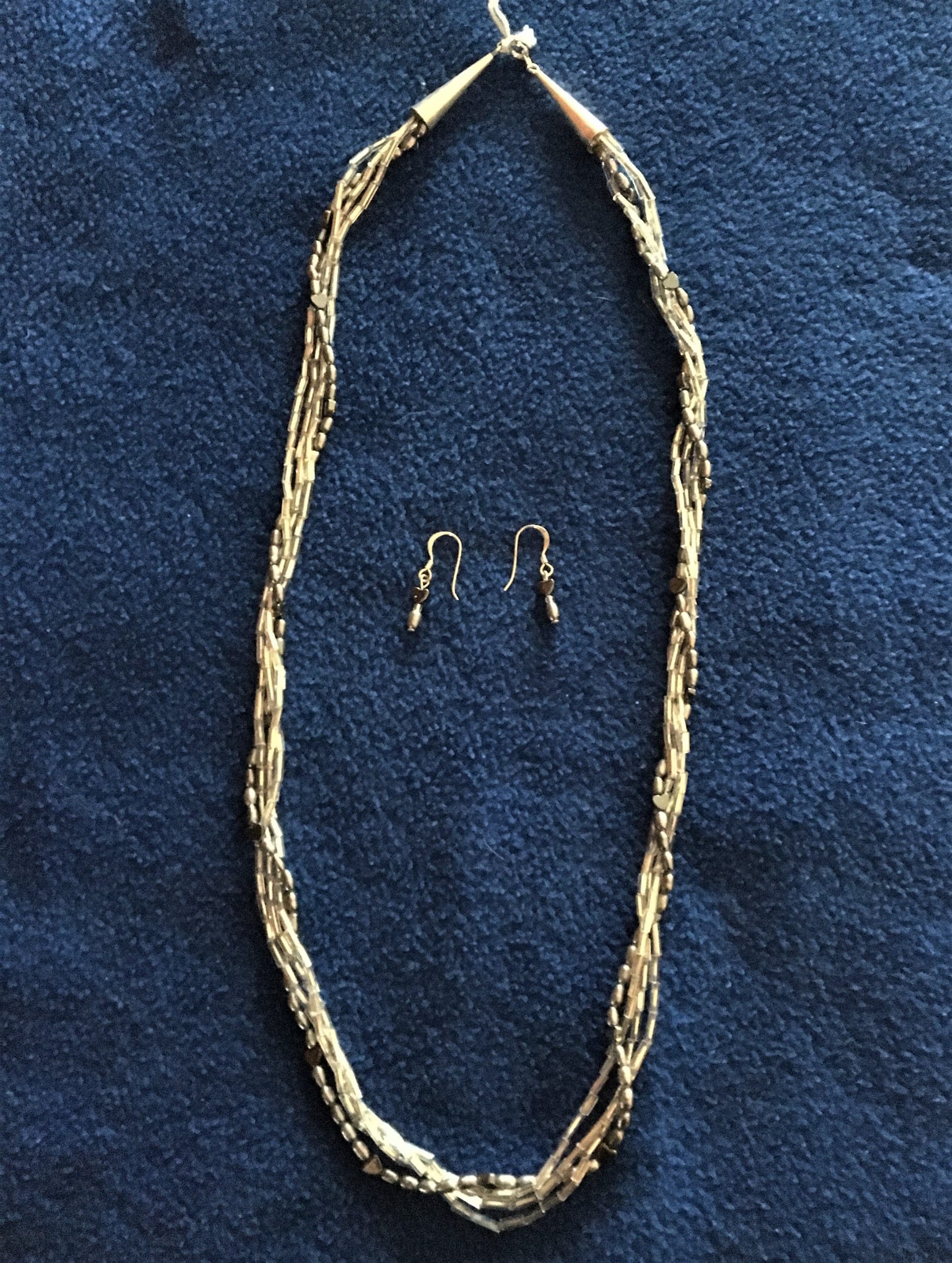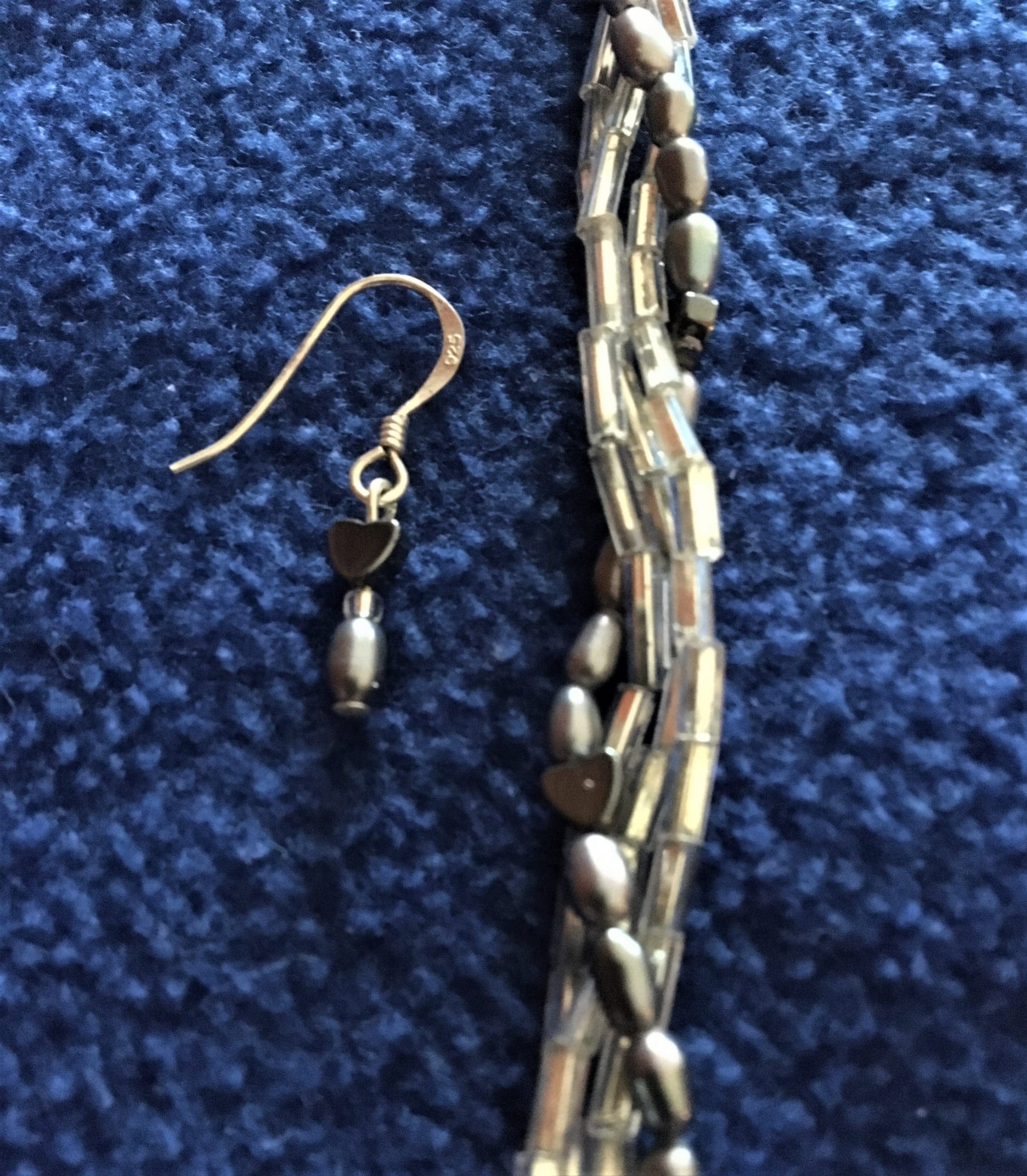 Silver bugle bead strands and a genuine black pearl strand accented with hematite hearts. Sterling silver clasp & earwires.