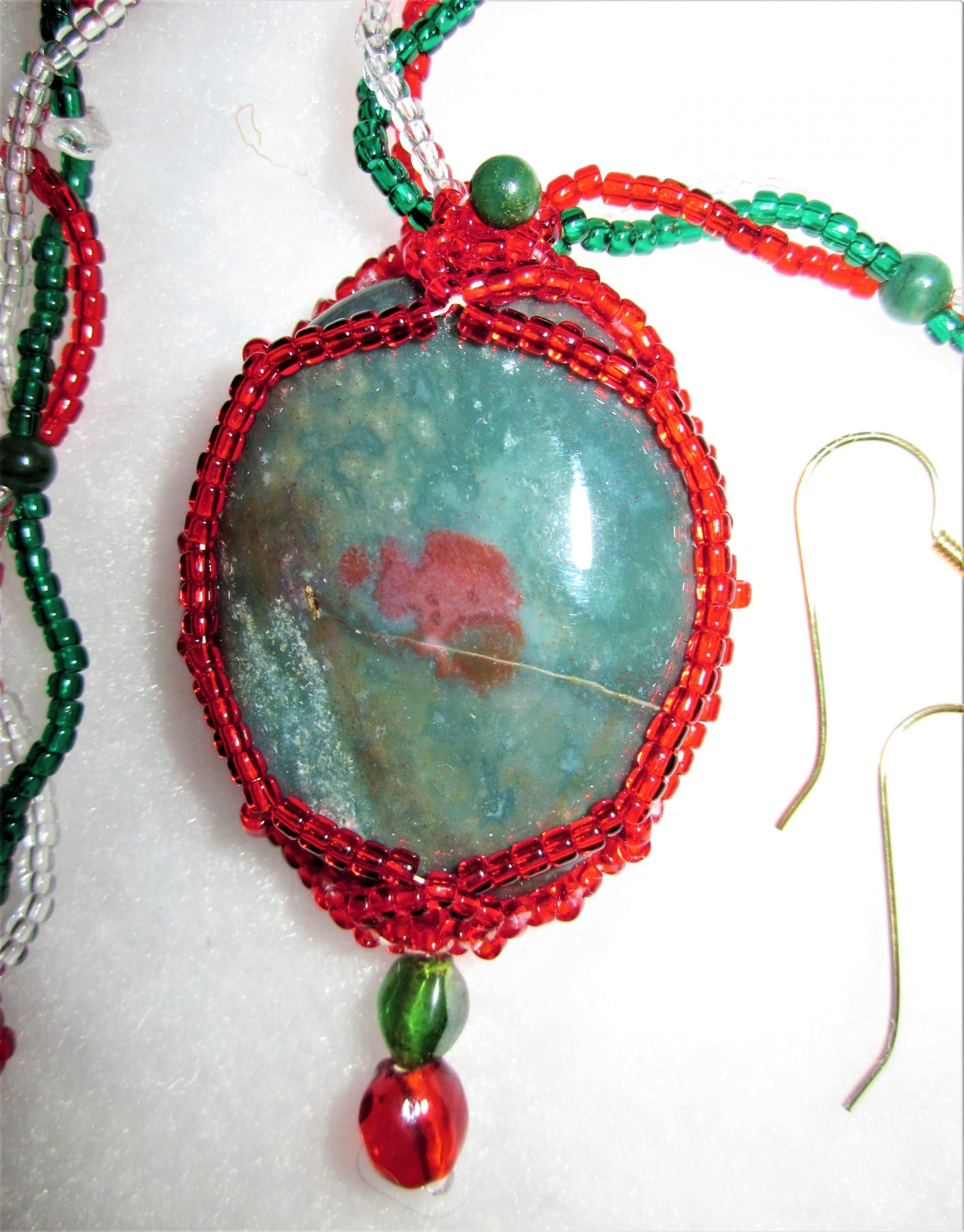 Bloodstone wrapped with hand woven glass seed beads & matching earrings.