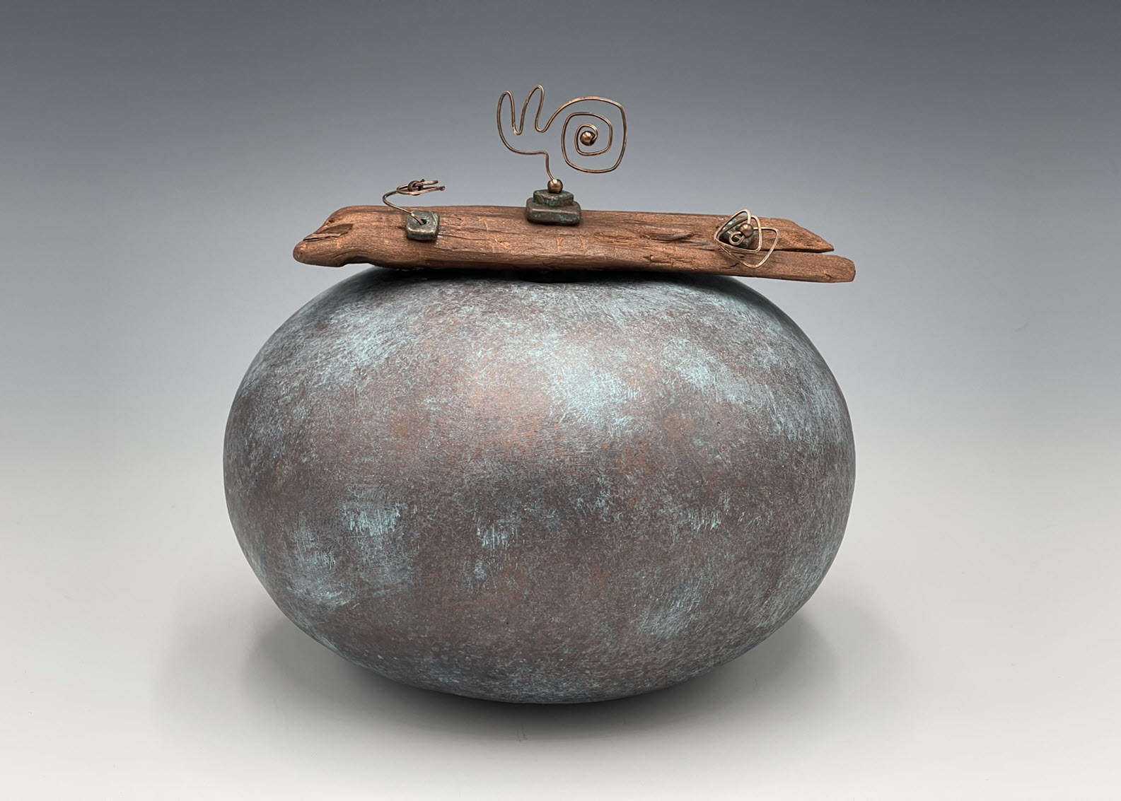 A thick-shelled gourd with bronze patina acrylics with driftwood and wire embellishments.