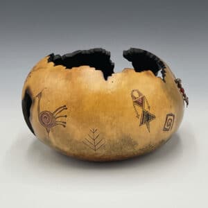 A thick-shelled gourd with pyrographed petroglyphs embellished with oils and bead figures. 8.5"Dx5.5"T - MB21-7