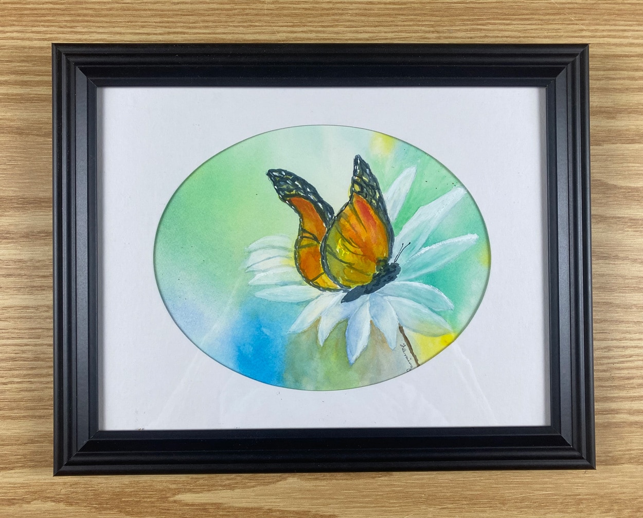Butterfly resting on a daisy. Watercolor | 15″W x 12″ H