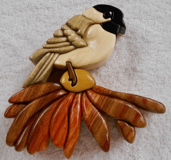 The art of painting in wood. Intarsia is created by selecting different types of wood, both exotic (from around the world) & domestic, using their natural grain patterns & colors (rather than dyes or stains) to create the different colors in patterns. Each piece is individually cut, shaped & sanded before fitting them together like a jig-saw puzzle. They are then glued to a piece of 1/4″ plywood backing cut in the shape of the final product. Sometimes, thicker pieces of wood are used to create a 3-D effect. Each intarsia piece is unique as is each overall design. This Chickadee & flower intarsia are made from all natural wood, no dyes or stains are used. Approx. size is 5×5 1/2″.