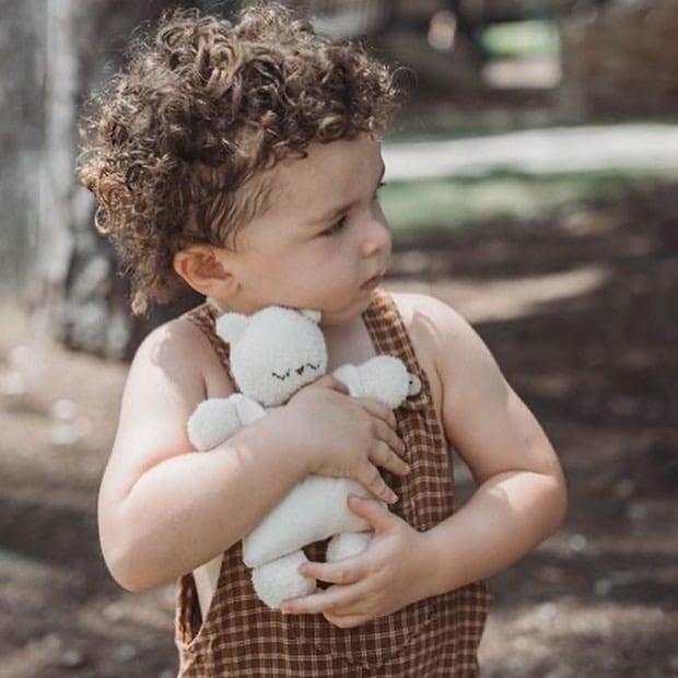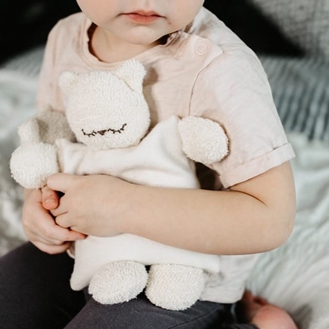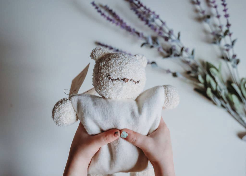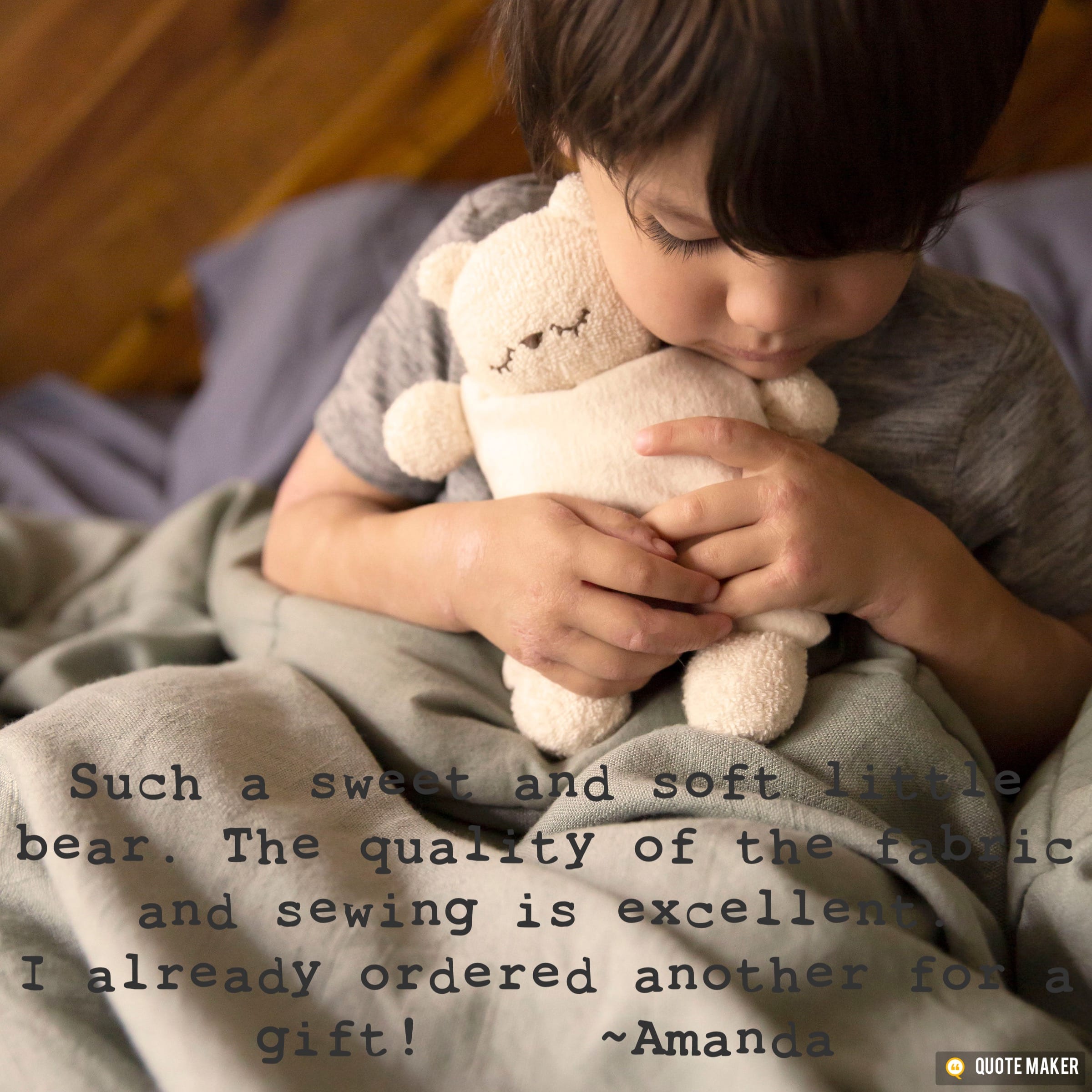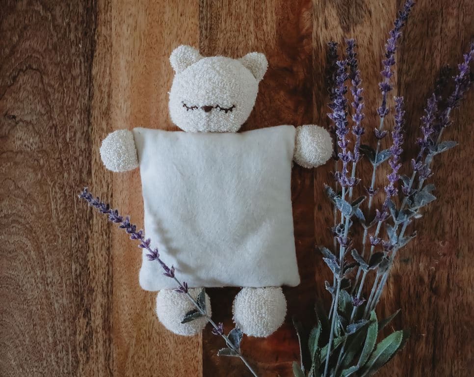 This original handmade bear will become a beloved companion to soothe your child to sleep. Filled with flax seed and lavender buds, this bear will provide a warm snuggle with a soothing scent. For ages 2 and up.