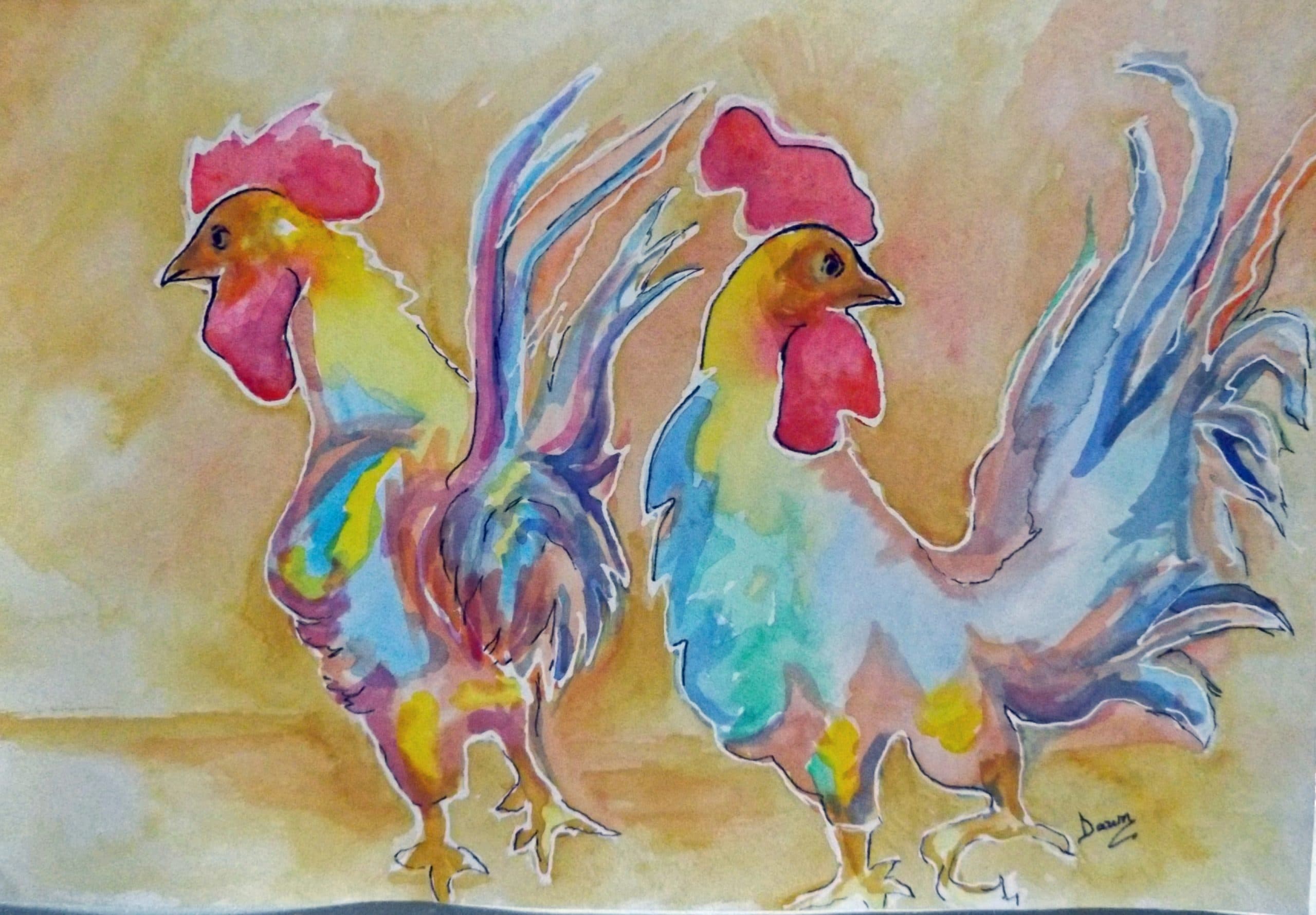 This original watercolor captures the whimsey of dueling roosters in pastel colors, 12 x 18, matted.