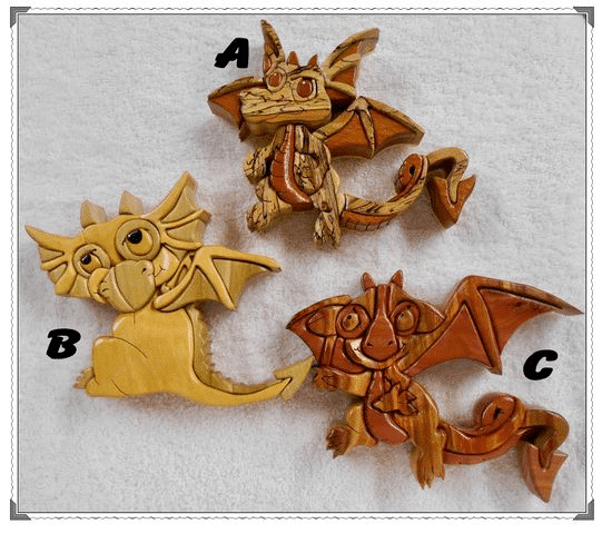 The art of painting in wood. Intarsia is created by selecting different types of wood, both exotic (from around the world) & domestic, using their natural grain patterns & colors (rather than dyes or stains) to create the different colors in patterns. Each piece is individually cut, shaped & sanded before fitting them together like a jig-saw puzzle. They are then glued to a piece of 1/4″ plywood backing cut in the shape of the final product. Sometimes, thicker pieces of wood are used to create a 3-D effect. Each intarsia piece is unique as is each overall design. These whimsical dragons are approx. 7 x 6″ & made from natural colored wood, no dyes or stains.