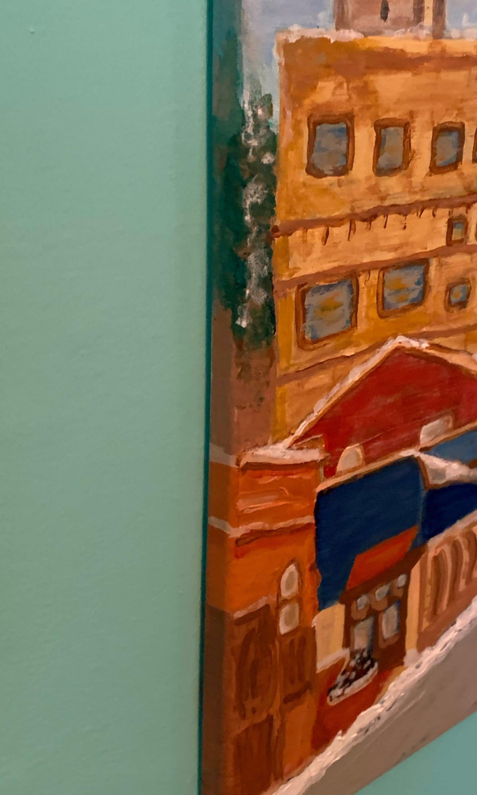 Since I relish working with lots of color, this acrylic effort actually took much more discipline in order to use muted colors to reflect the warmth of the early evening summer sun. I think it’s a great way to brighten a kitchen or dining area wall.