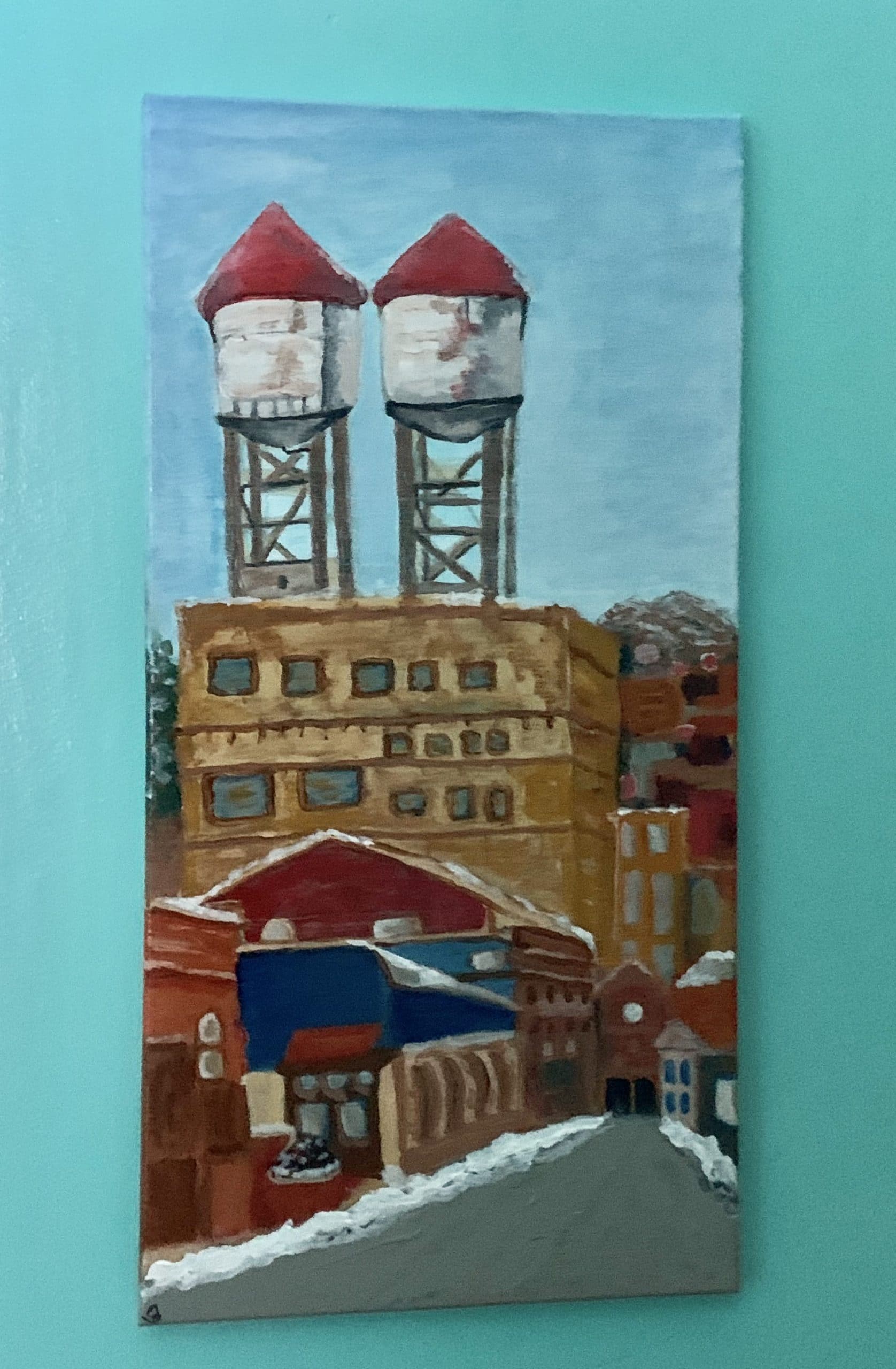 This 12” x 24” acrylic painting is inspired by the industrial look of the water towers in the retail area near the pier in Duluth.