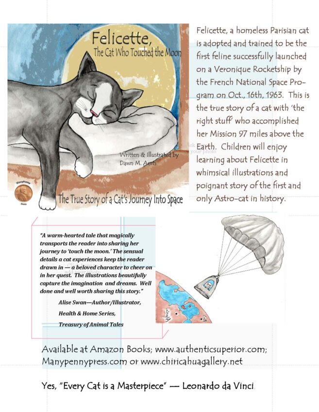 A delightful illustrated children’s book which tells the “true story of a cat’s journey into space.” Featuring original artwork by its author, Dawn M. Aerts.