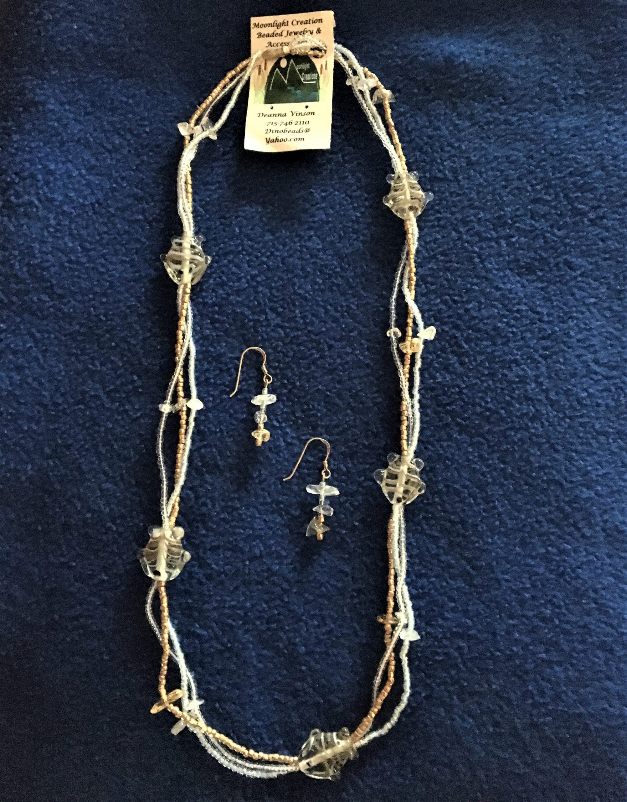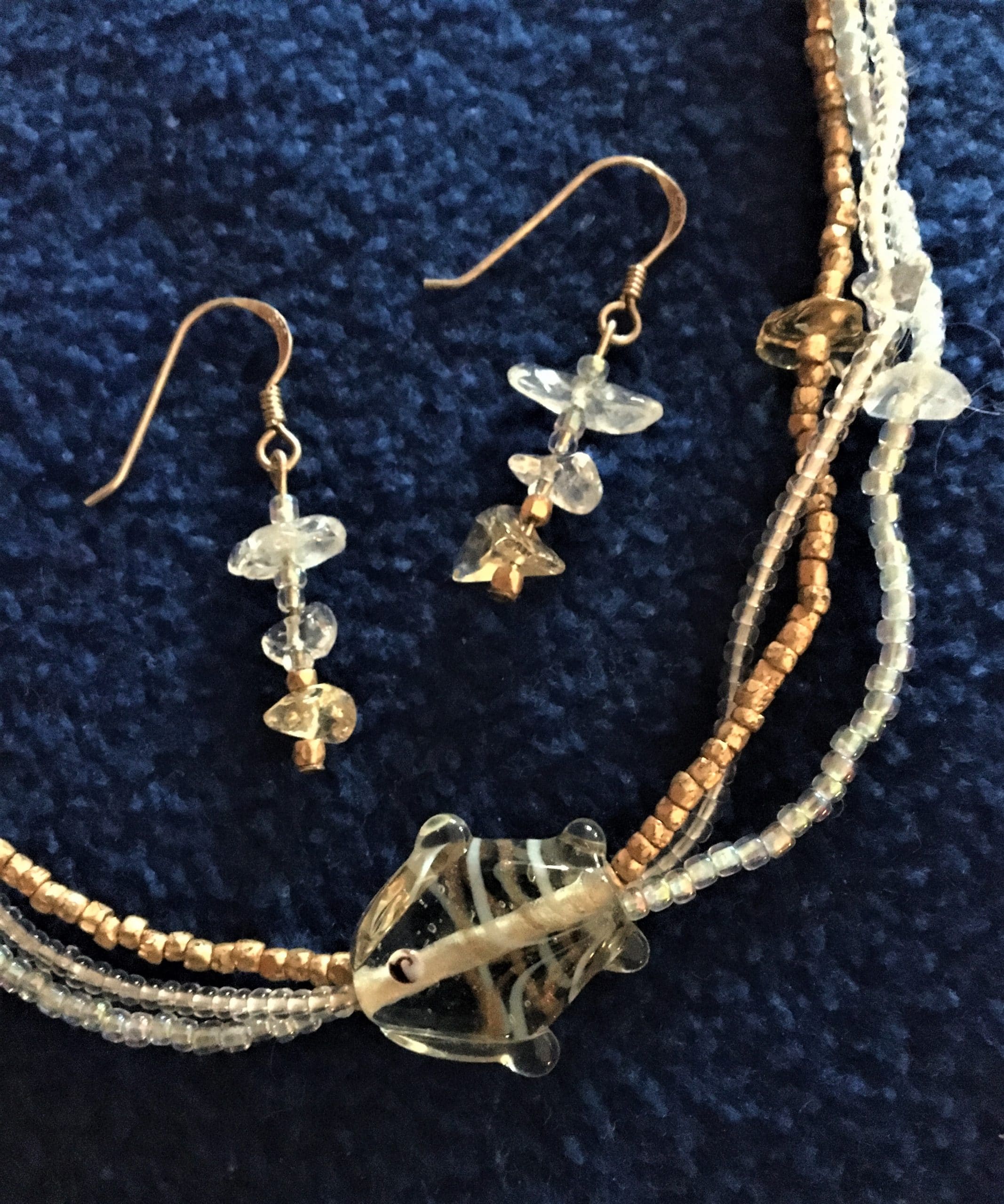 Blue, gold, & clear seed bead strands accented with glass fish, citrine, and quartz beads. Sterling silver earwires.
