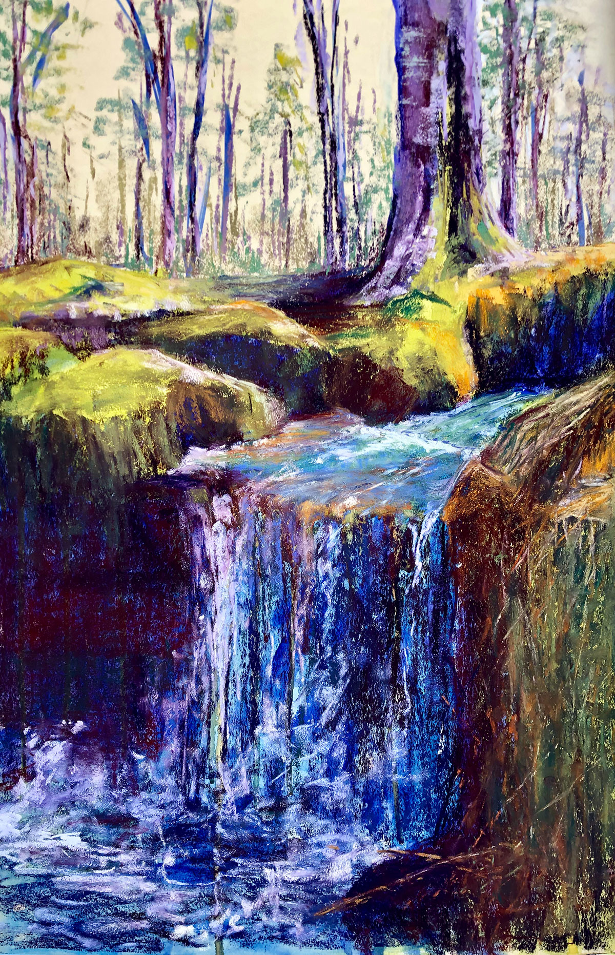 Original painting of a stream during spring runoff. Pastel on sanded archival paper. 15X22 unframed. 17X24 framed.