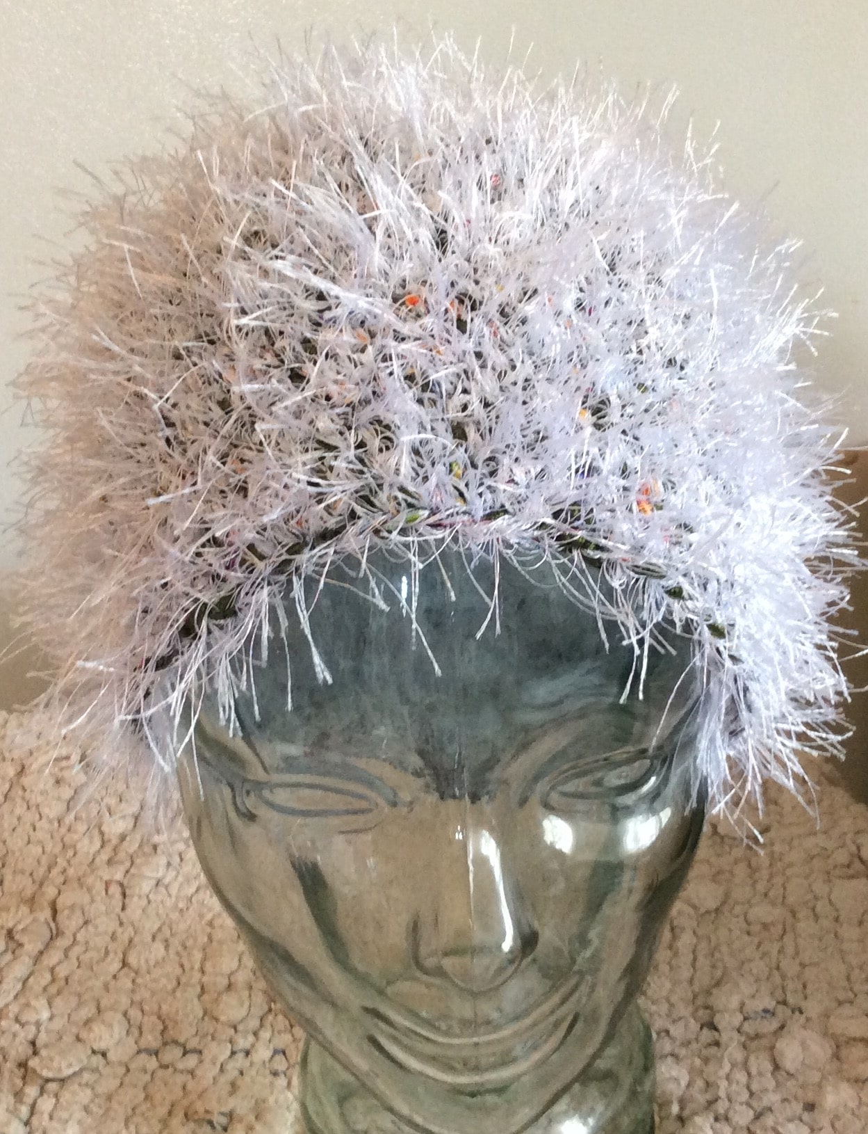Fuzzy eyelash beanie type hat.
