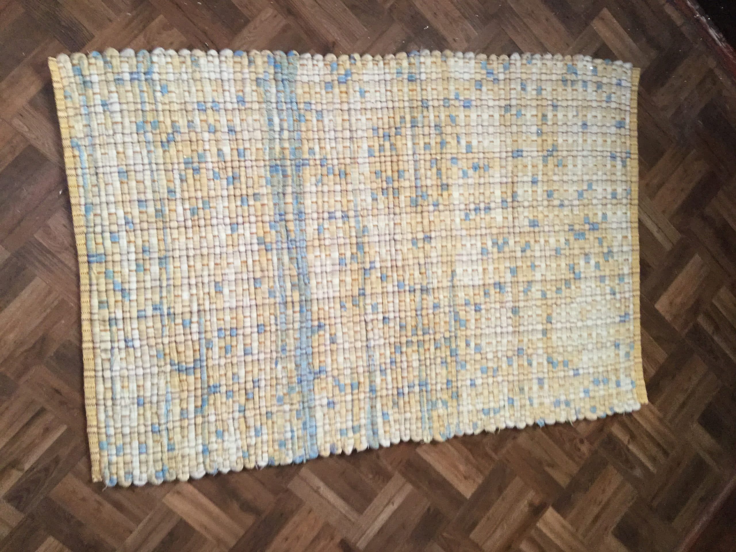 Weft is wool blanket strips, warp is pearl cotton. Finished hem.