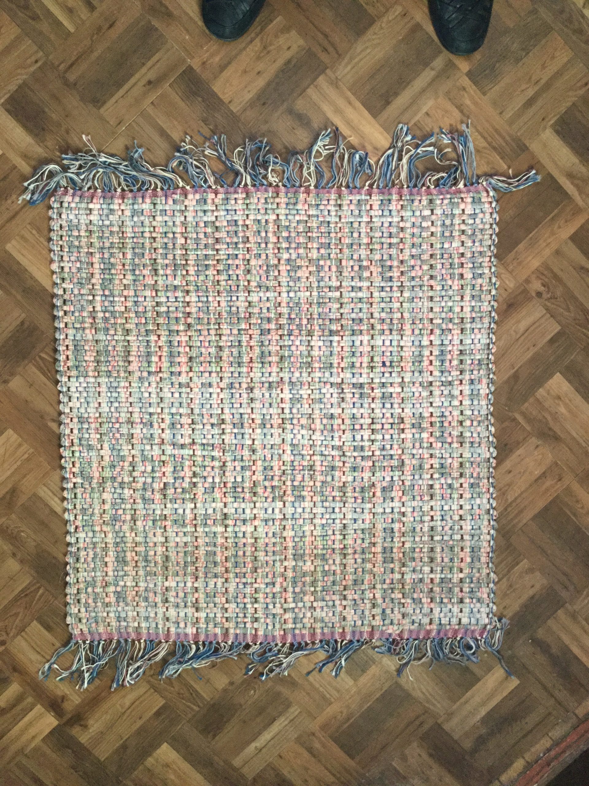 Weft is cotton/poly fabric strips, warp is cotton rug warp.