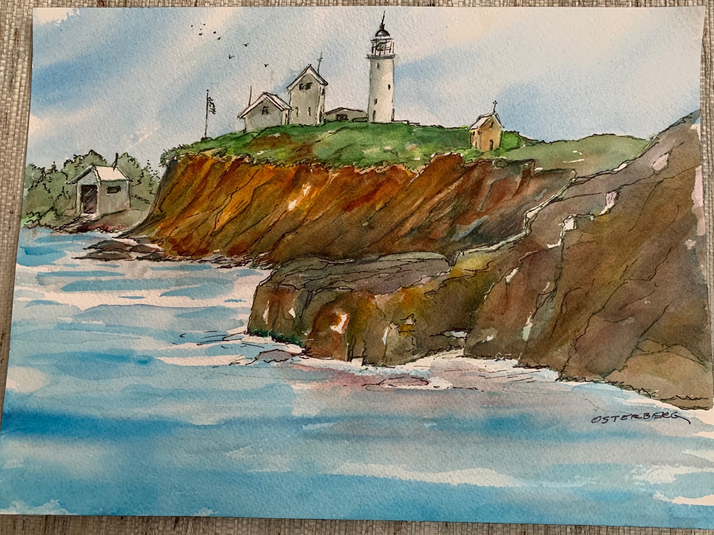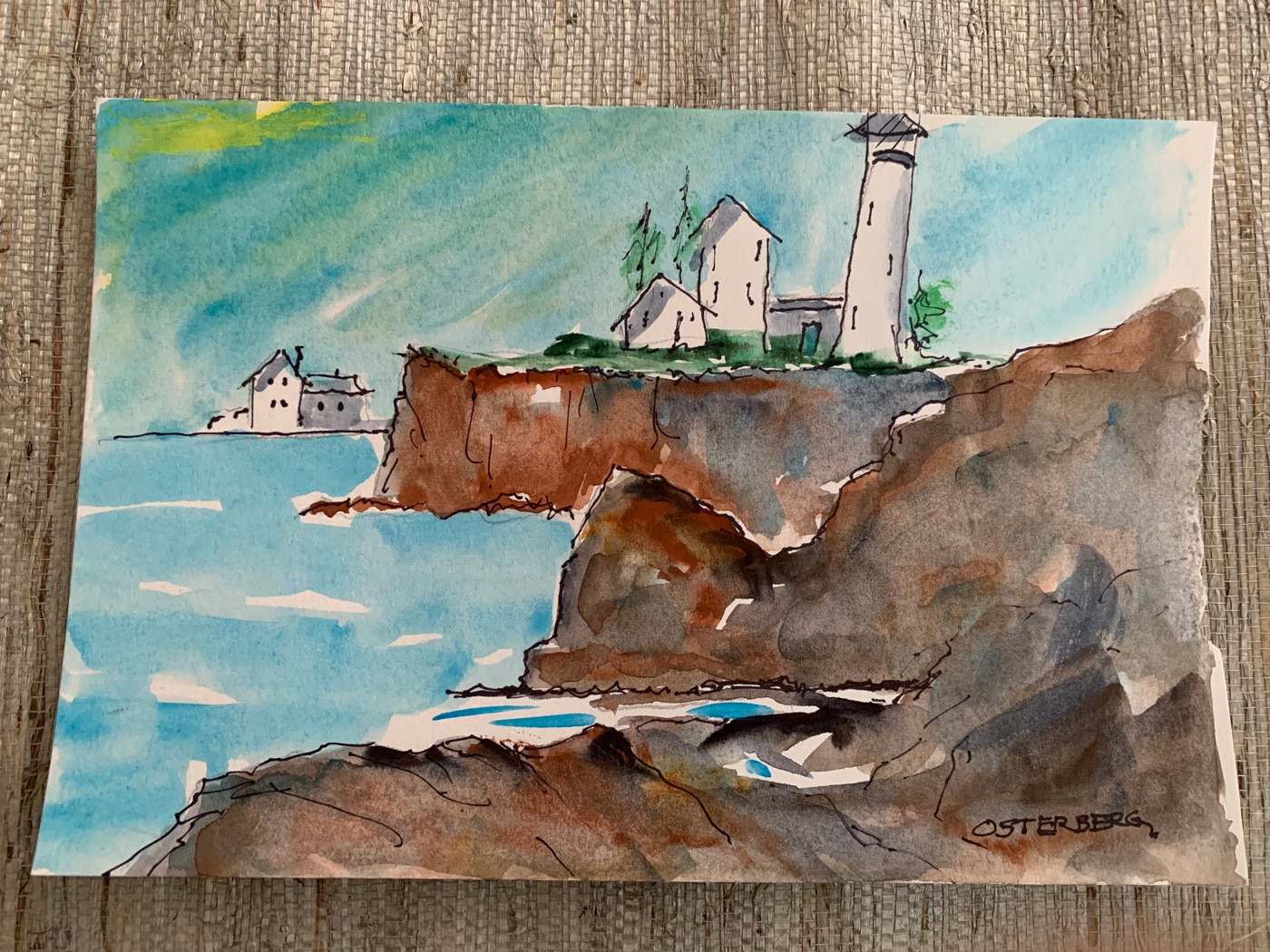 Framed watercolor painting featuring a lovely scene of cliffside houses and a lighthouse.