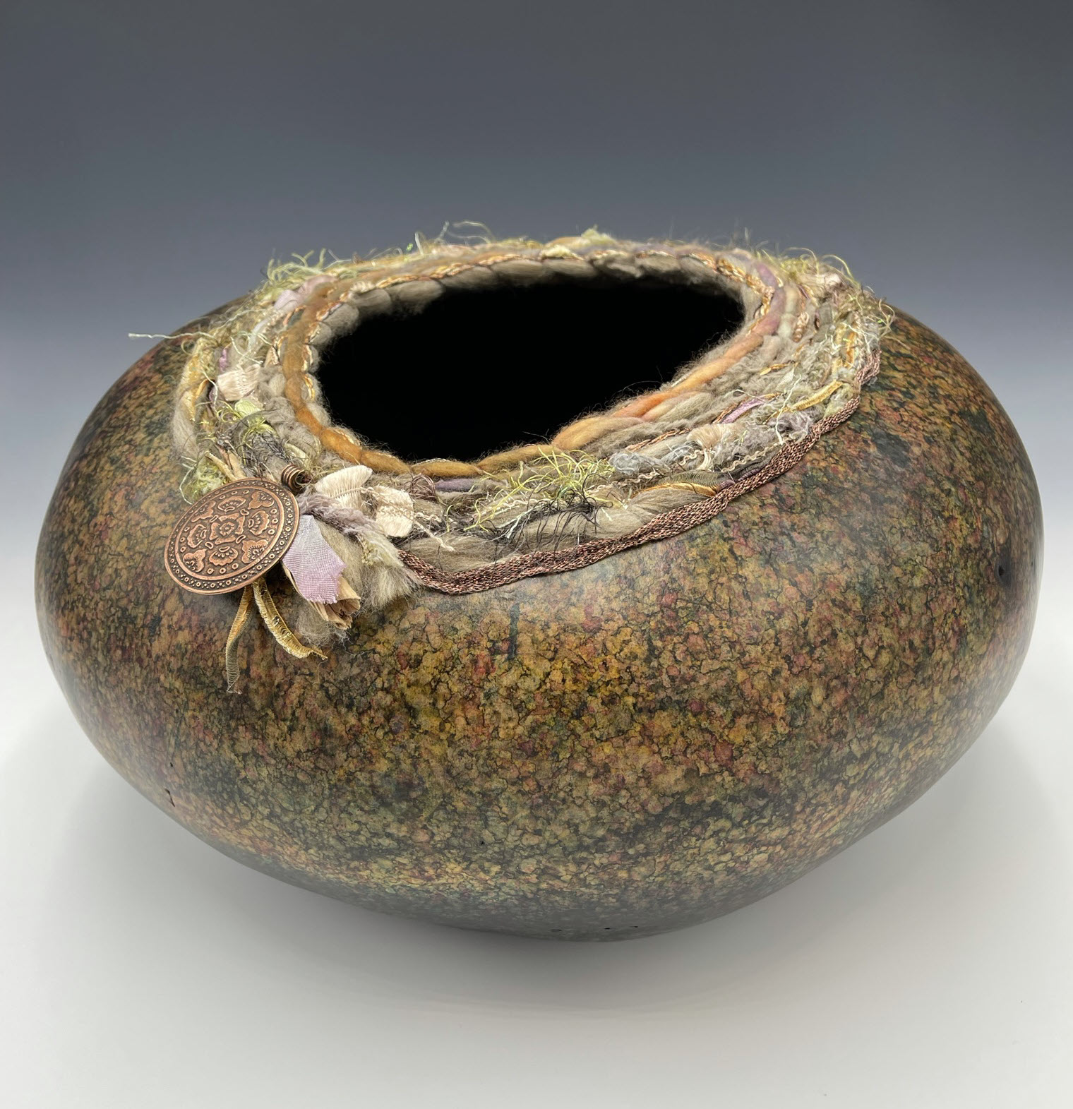 A large thick-shelled gourd colored with alcohol inks and mixed fiber coiled rim and antique copper pendant.
