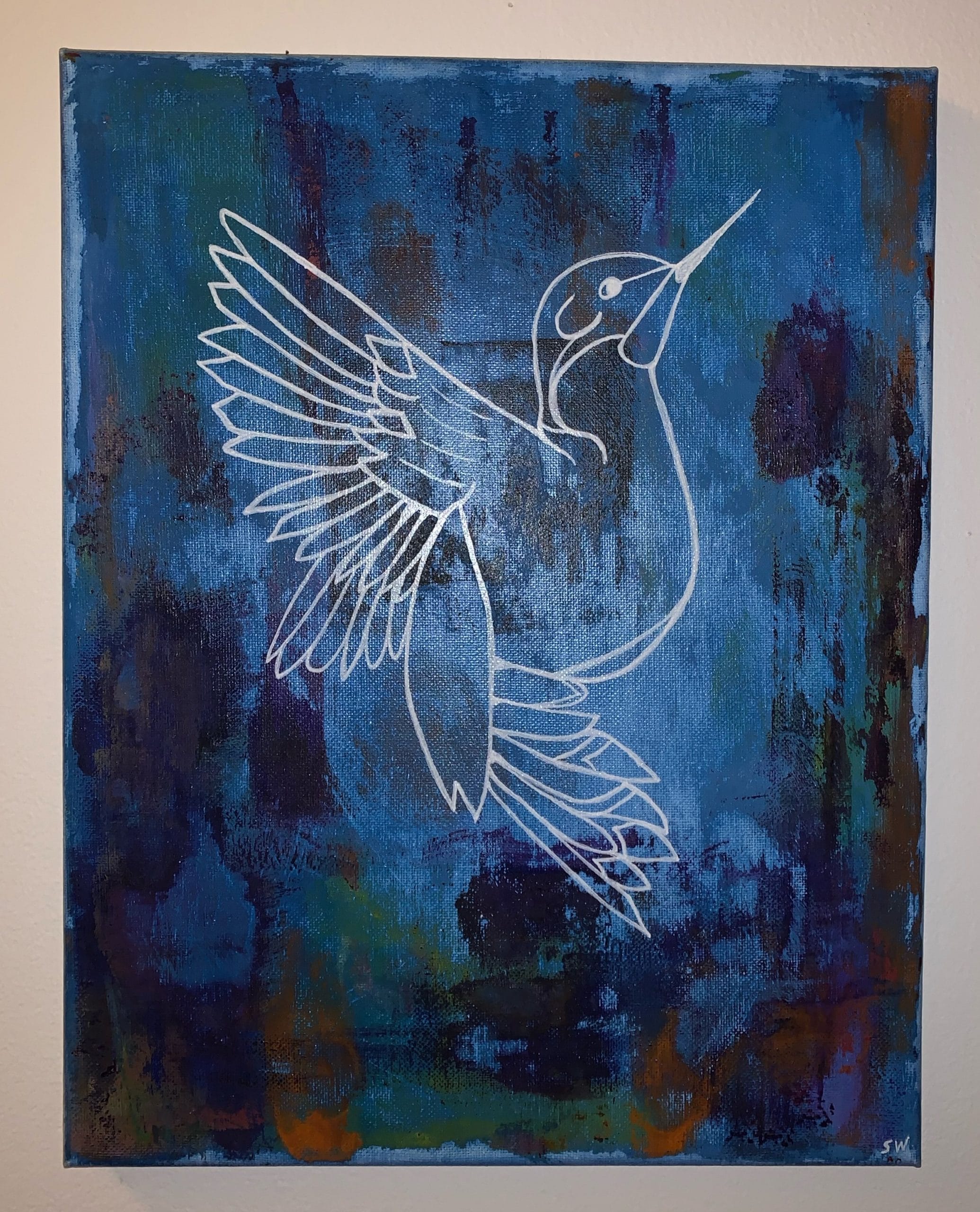 The background of this painting is an abstract of blues with highlight bursts of color.  Hummingbird line drawing was drawn freehand in white.
