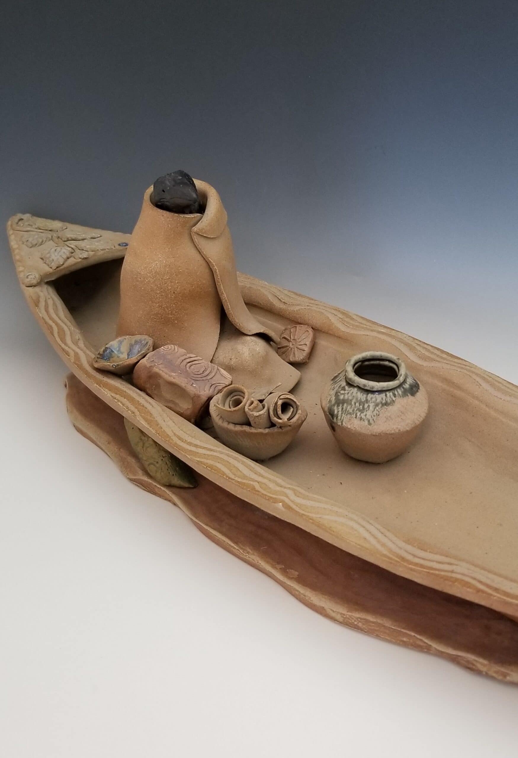 This ceramic sculpture is high fired stoneware, approximately 18 inches long by 7 inches wide. The raven spirit sets out upon an island journey, prepared to stay as long as needed.