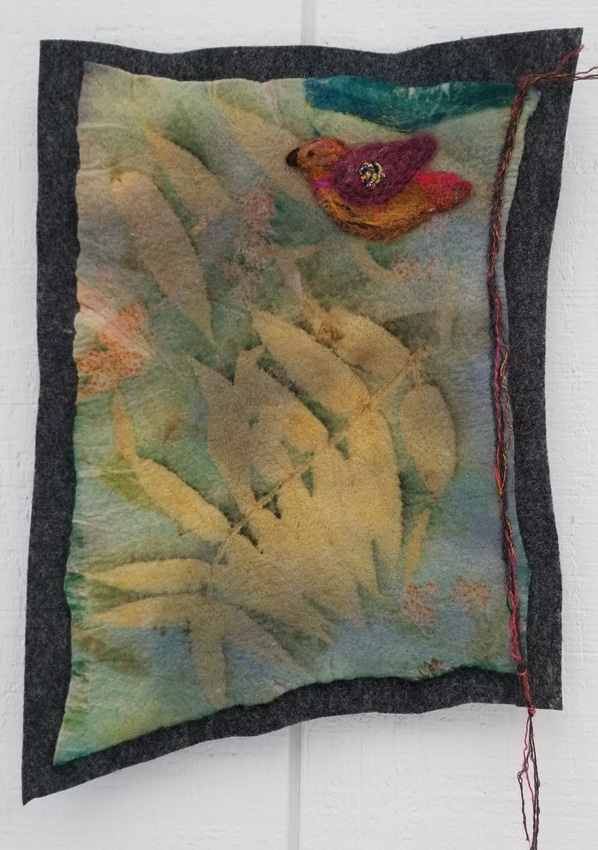 Hand dyed botanical print made with Madeline Island sumac, with hand-felted bird.
