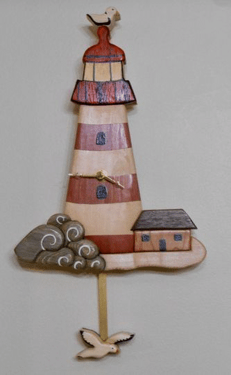 Unique lighthouse clock with a seagull swinging on the pendulum. Made from natural colored wood with Quartz clock movement uses AA battery (not included). Approx. 8×11″.