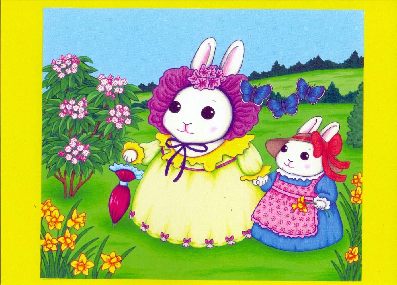 Although it’s unlikely that Mother Bunny will need that umbrella, she’s making sure that little Amanda won’t get wet even if a shower appears. This is a card to cheer up any day. 5″ x 7″ greeting card.
