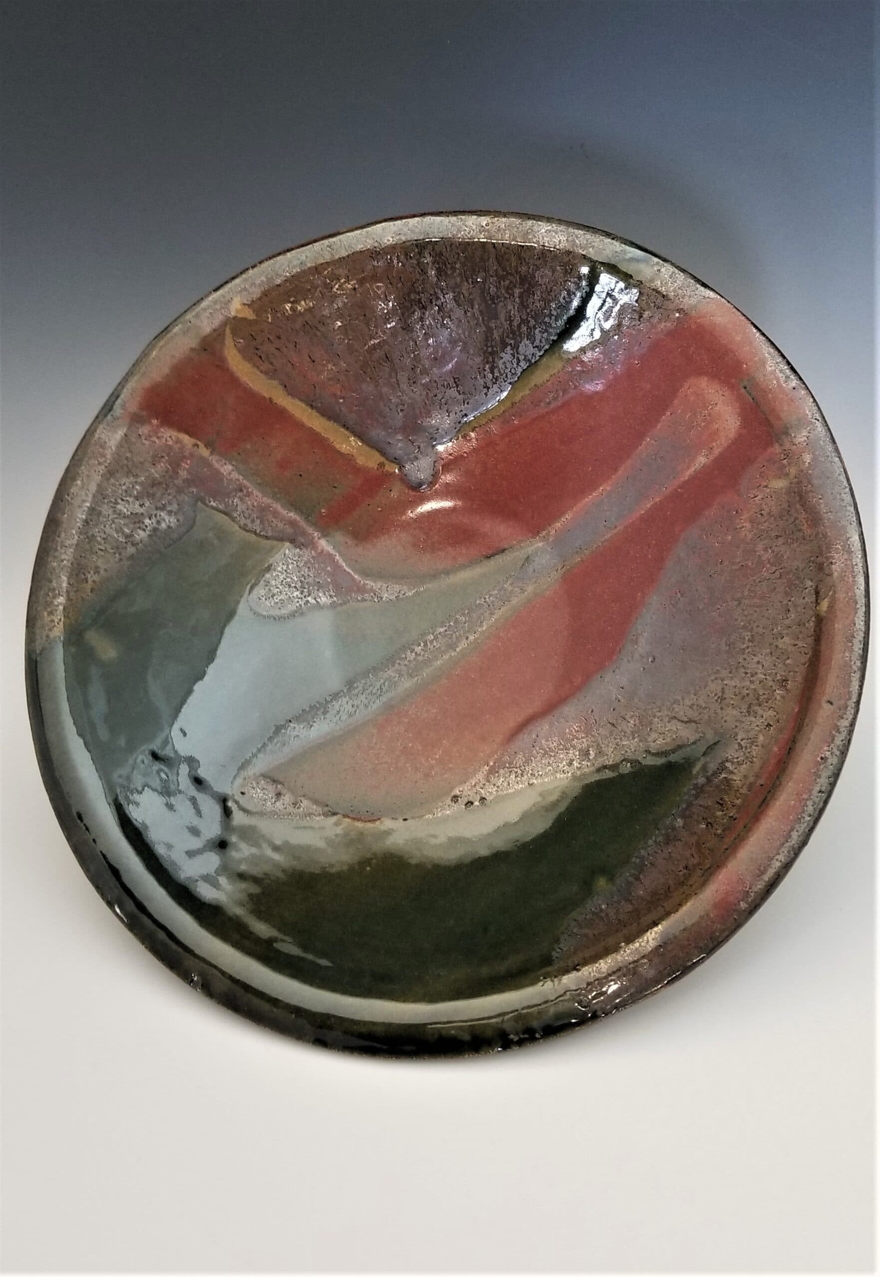 A gorgeous blend of greens, russet, and combinations of the 2 glazes grace this serving bowl. 12 by 5 inches. Oven, dishwasher and microwave safe.