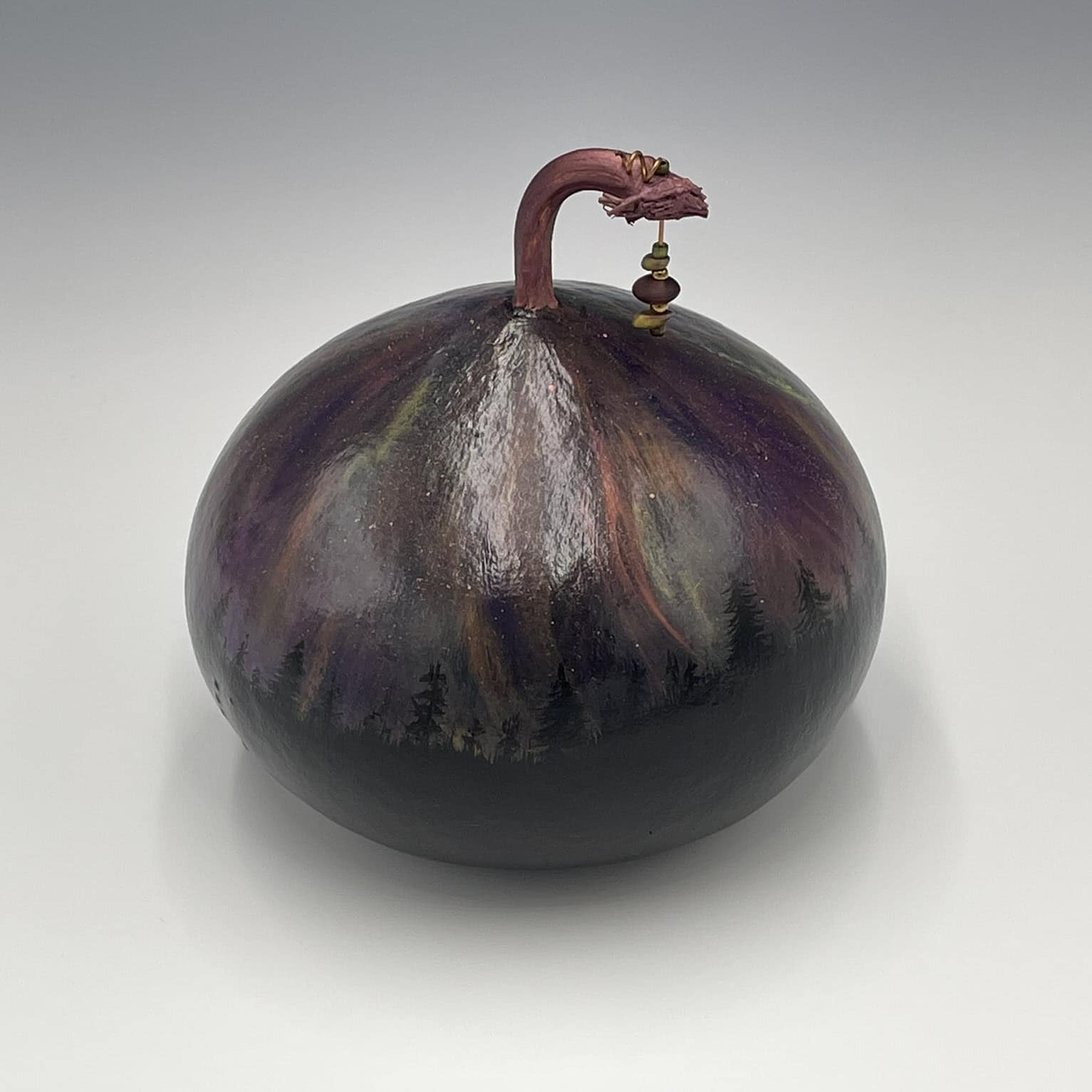 An artistic rendition of the Northern Lights painted with acrylics on a thick-shelled canteen gourd, embellished with copper wire and beads.