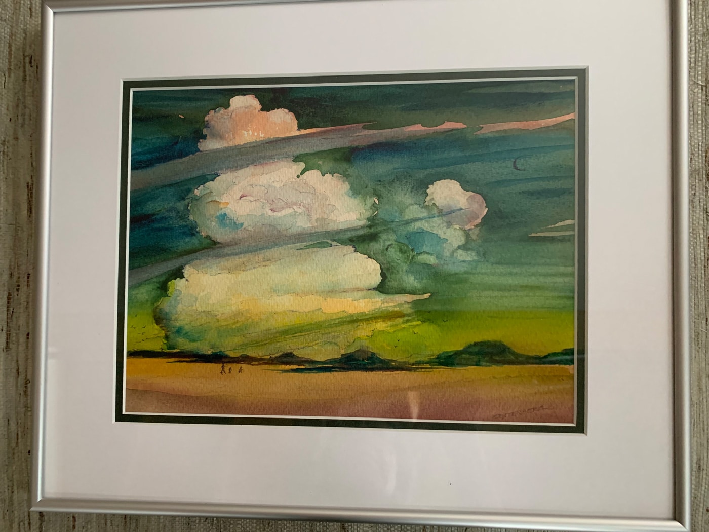 Framed watercolor painting featuring a gorgeous sky scape of a thundercloud over the landscape of the Southwest.