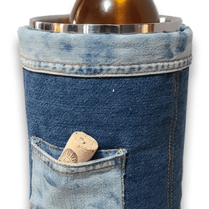 Each unique wine cooler is fashioned from quilted fabric with an insulated lining. Each has a removable Oggi stainless double-walled canister. The base is crafted from finished wood. You supply the wine or champagne!