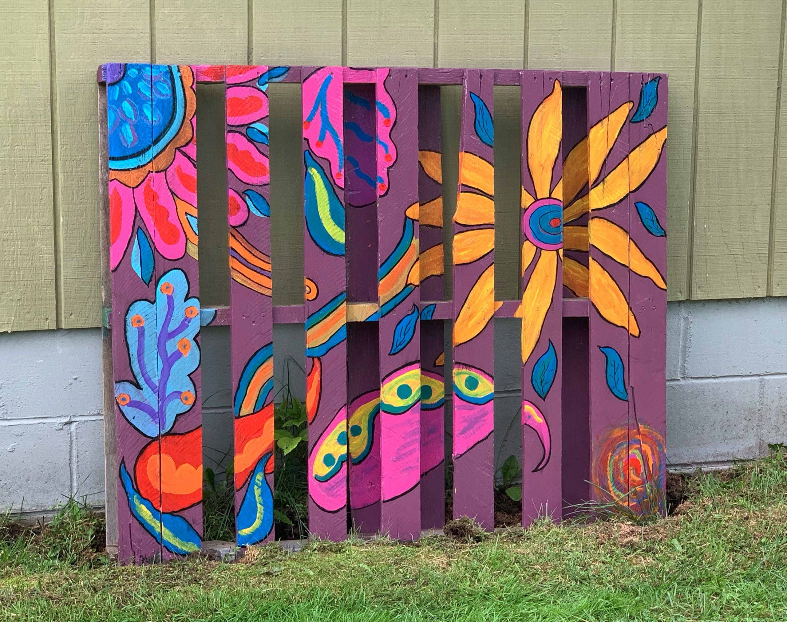 This colorful pallet has been living outside since late summer.  There is normal wear/tear at bottom of pallet as I buried into the ground a few inches.