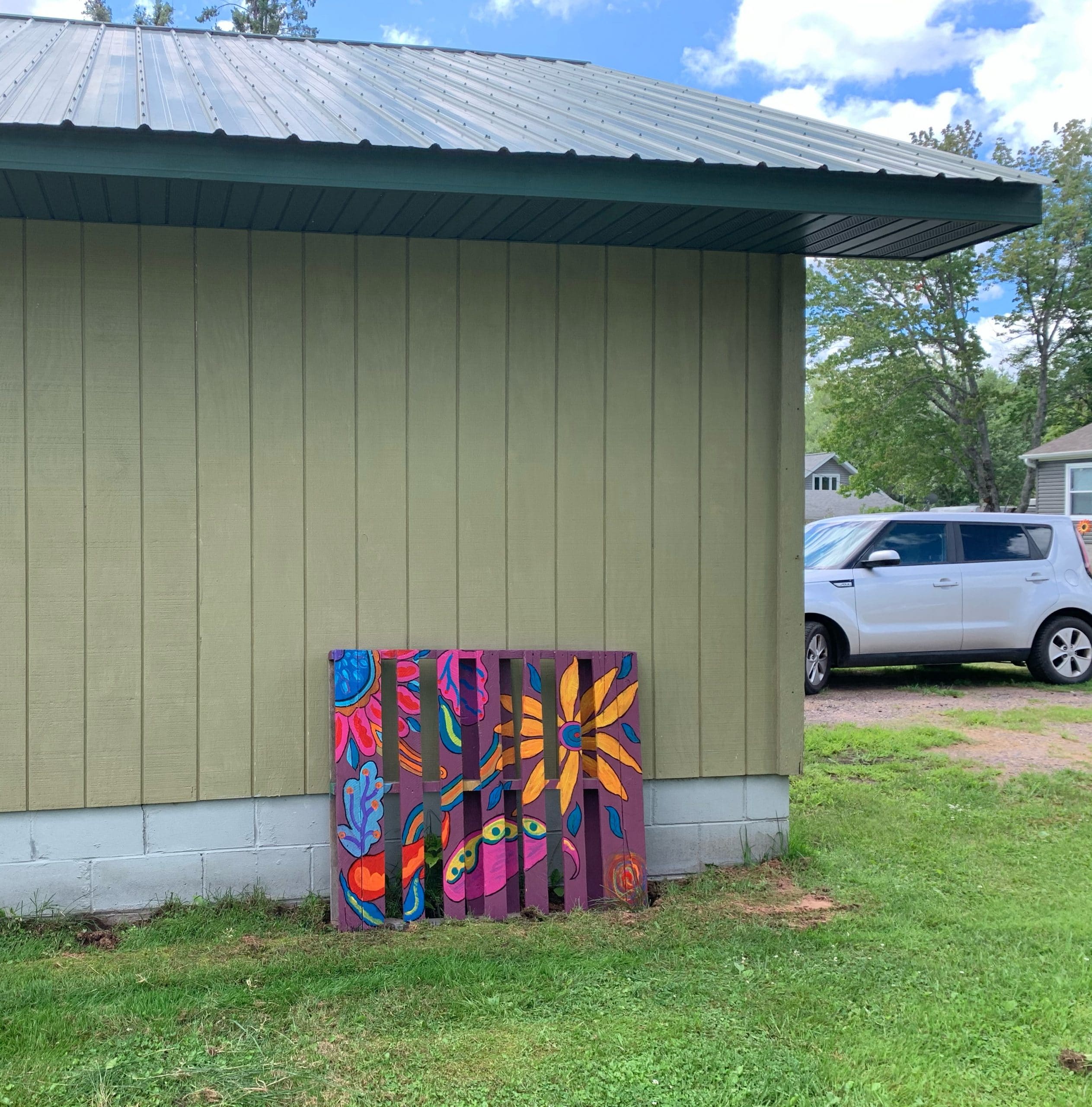 47.5” wide x 40” tall wood pallet painted with acrylic paint & varnished to protect from weather.