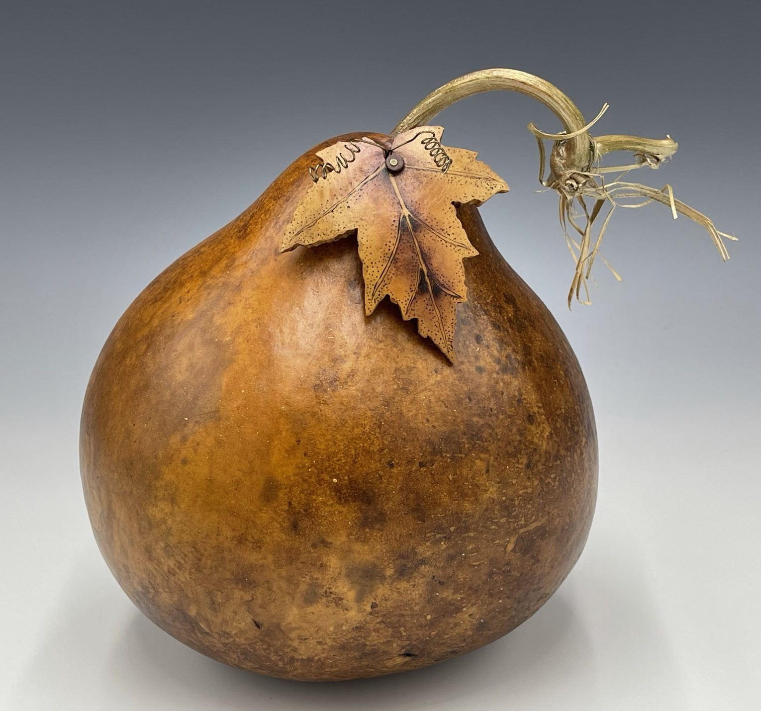 A thick-shelled pear-shaped gourd finished with alcohol inks, leather dyes; embellished with a pyrographed leaf and copper tendrils.