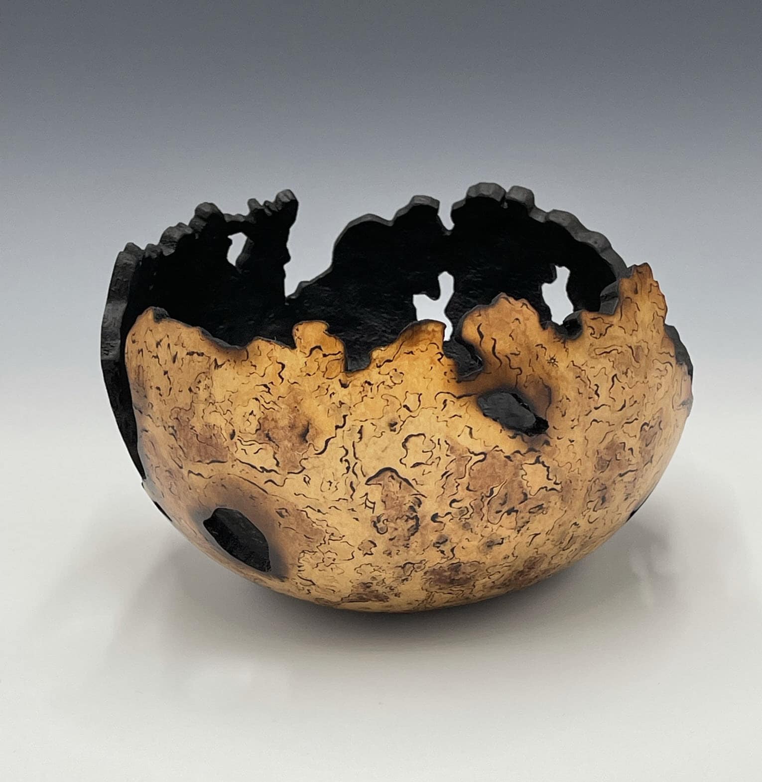 A thick-shelled gourd pyrographed with petroglyph designs and stained with earth-toned dyes.