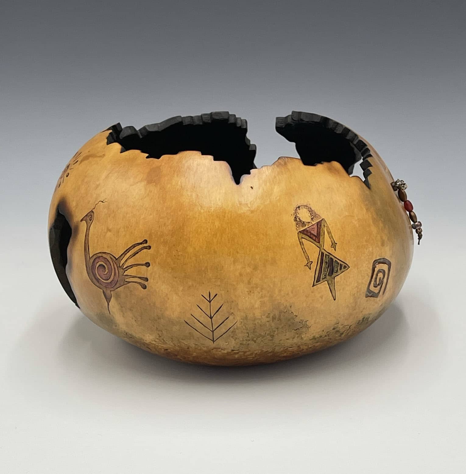 A thick-shelled gourd with pyrographed petroglyphs embellished with oils and bead figures.