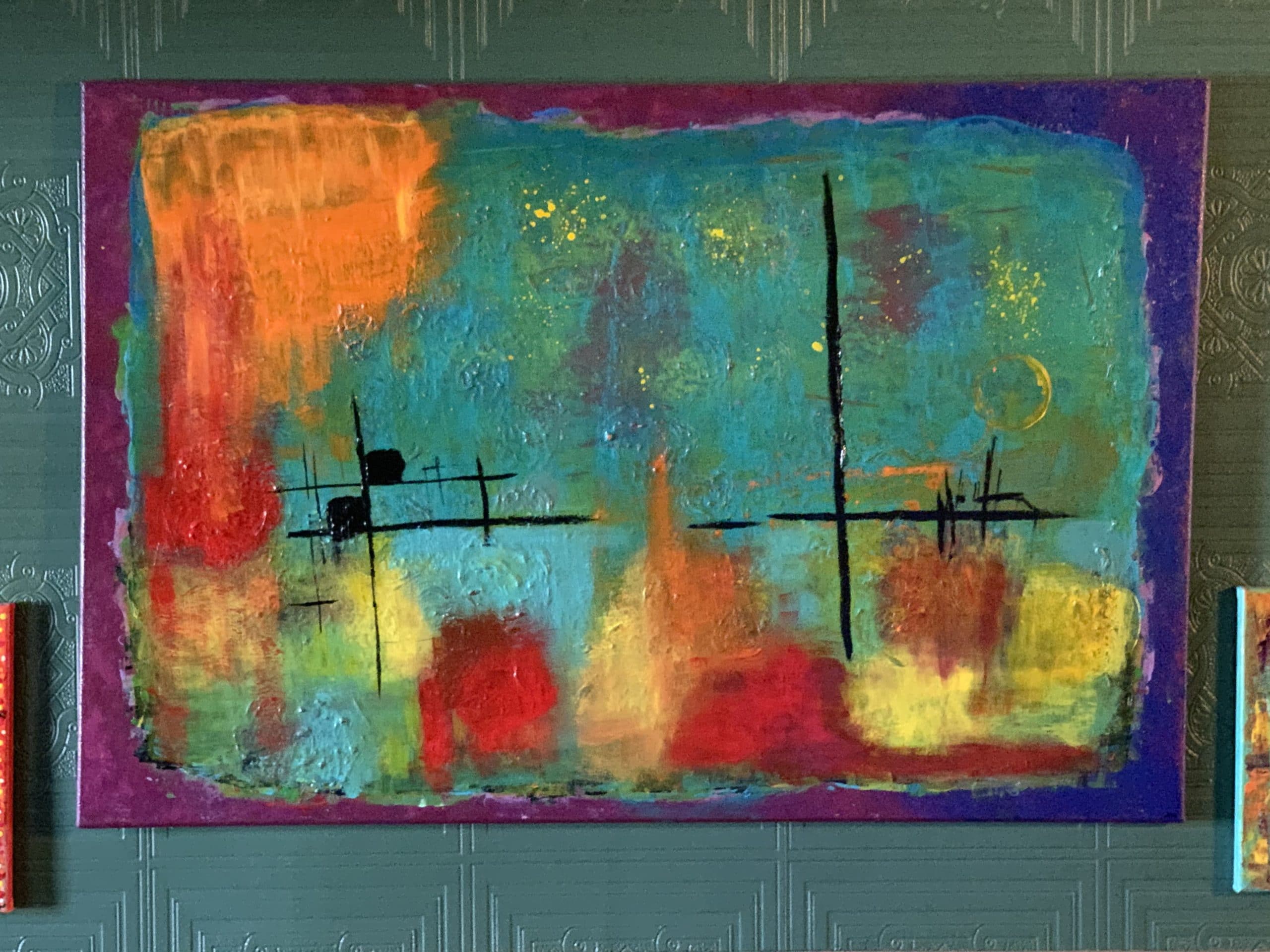 I used brushes and a chopstick with acrylic paint on a stretched canvas to create a textured abstract expression of an inlet of Lake Superior. Sealed with varnish to protect the painting & colors.  Although it’s unframed, the edges/sides of the canvas are also painted for a finished look.