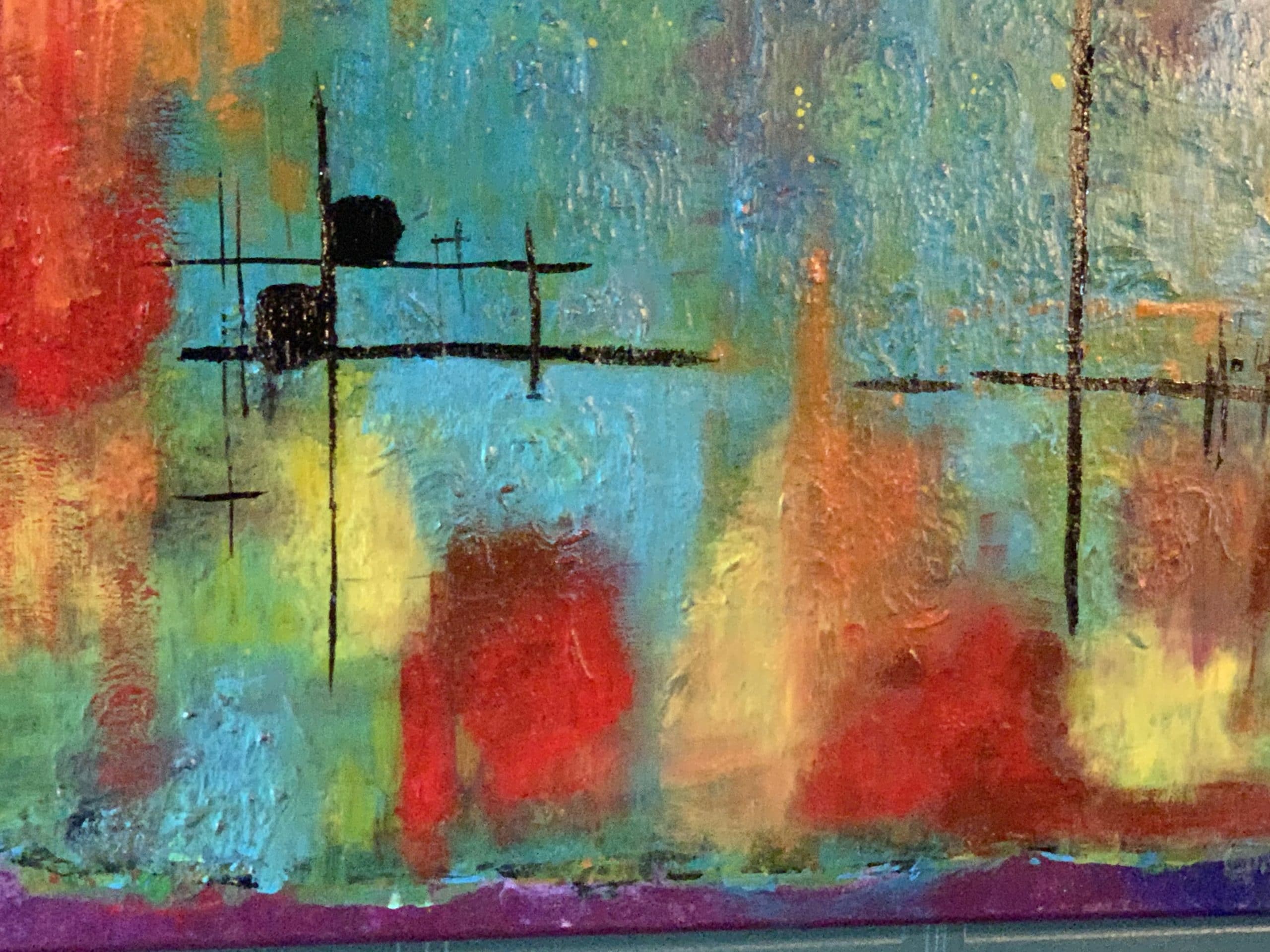 Fun, whimsical flower abstract painting with lots of texture & lots of color created with a retro pop art feel. My kids think I’m an old hippie so I’ve decided to embrace it.