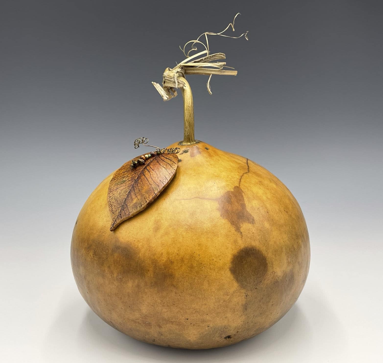 A thick-shelled gourd finished with alcohol inks, leather dyes; embellished with a pyrographed leaf and copper tendrils.