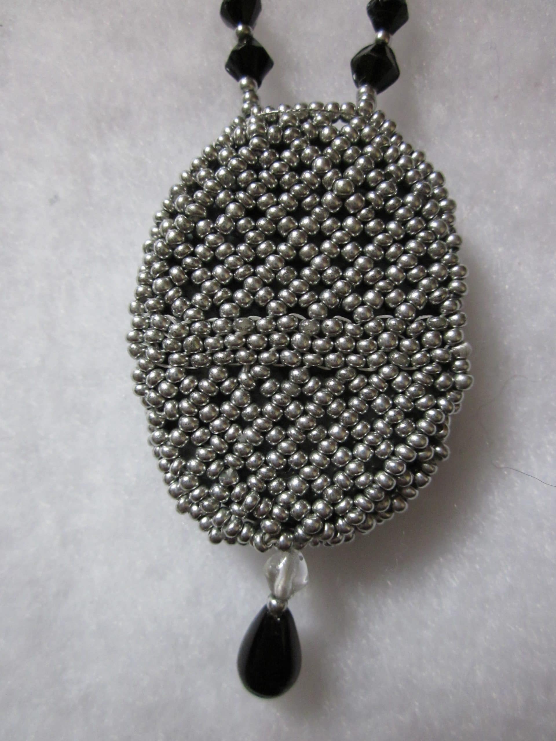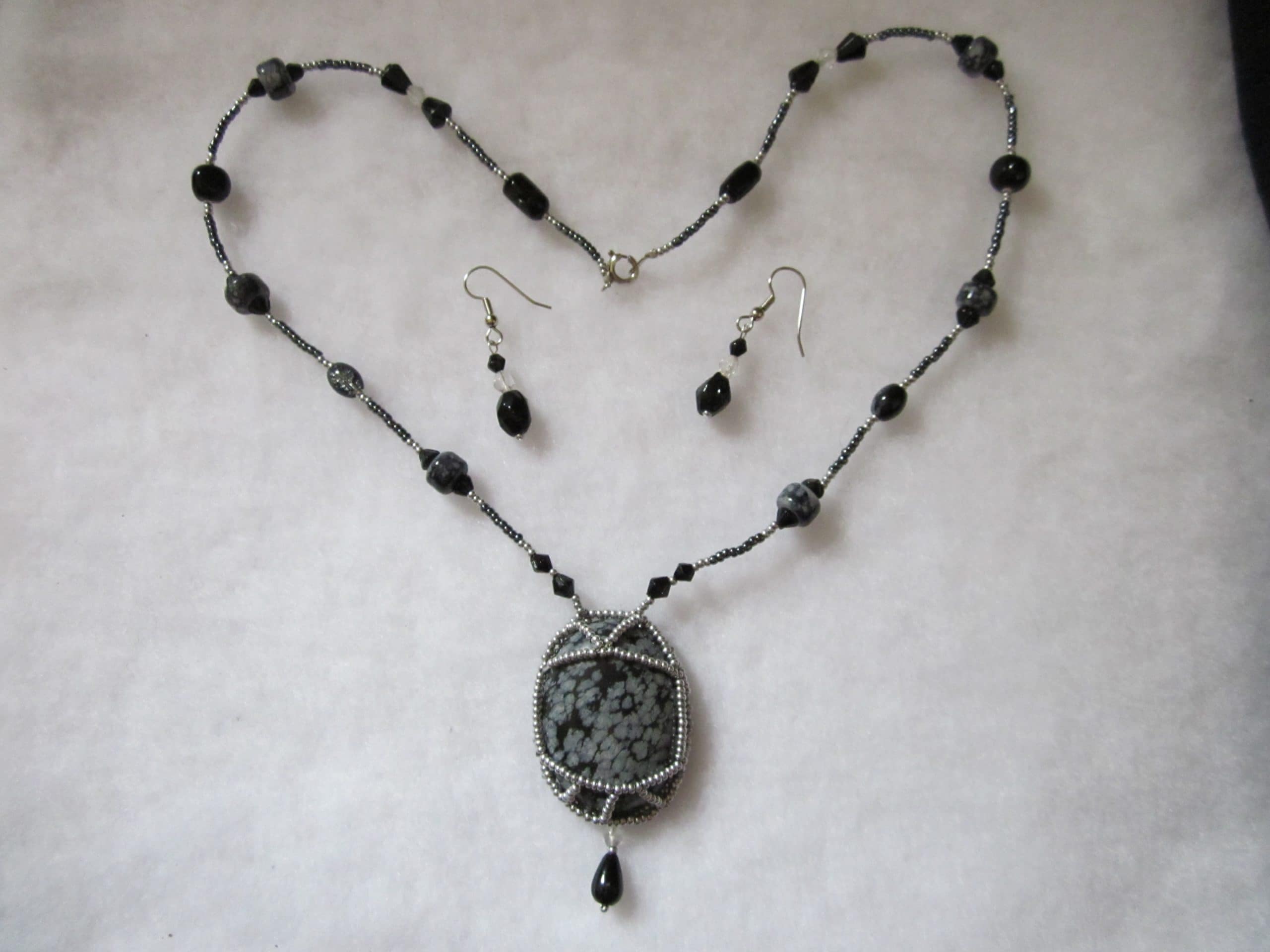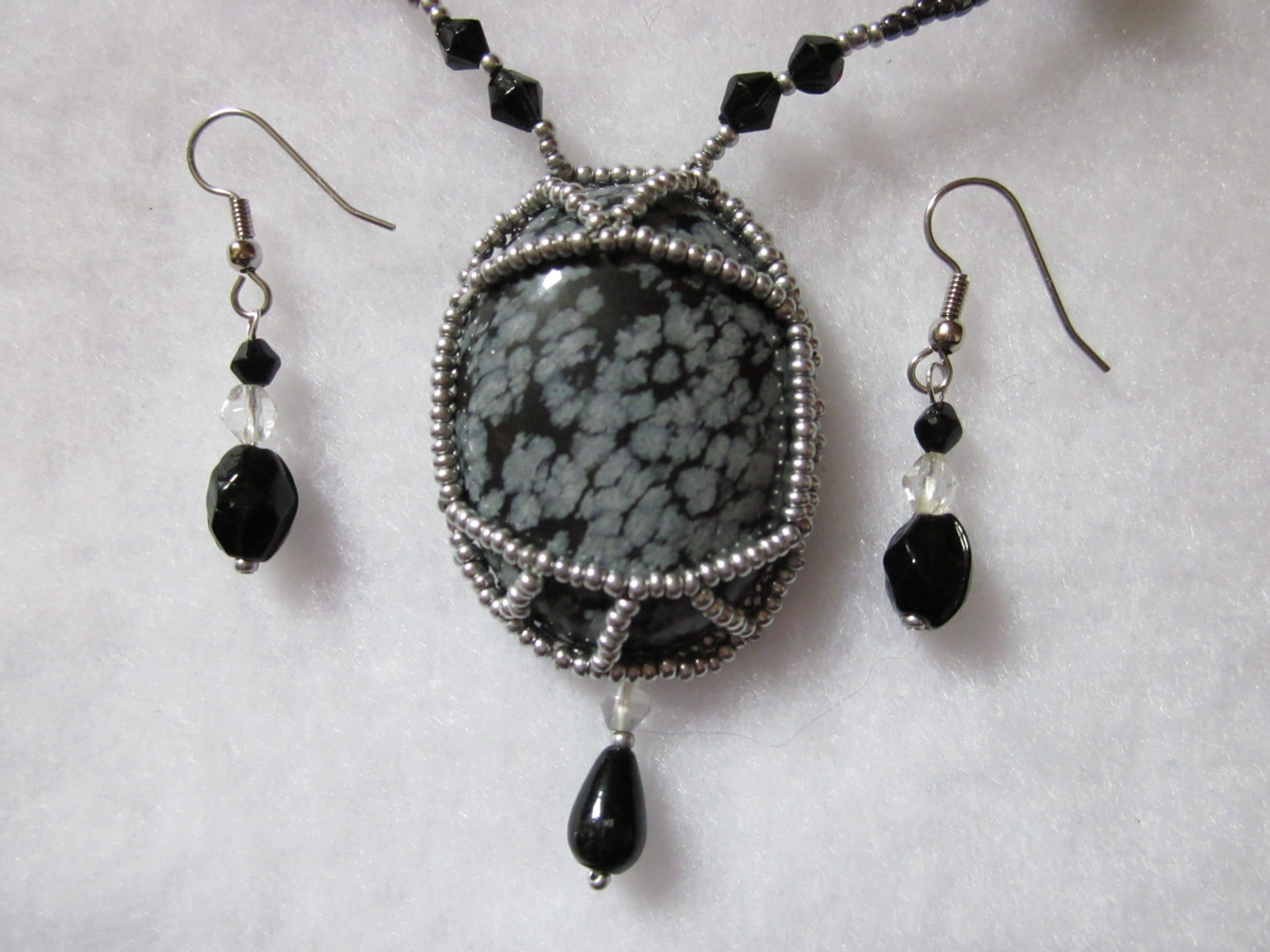 Snowflake Obsidian Cabochon wrapped in hand woven glass seed beads. Comes with matching earrings with silver tone ear wires. Necklace is 21″ and stone is 2″ with embelishment.