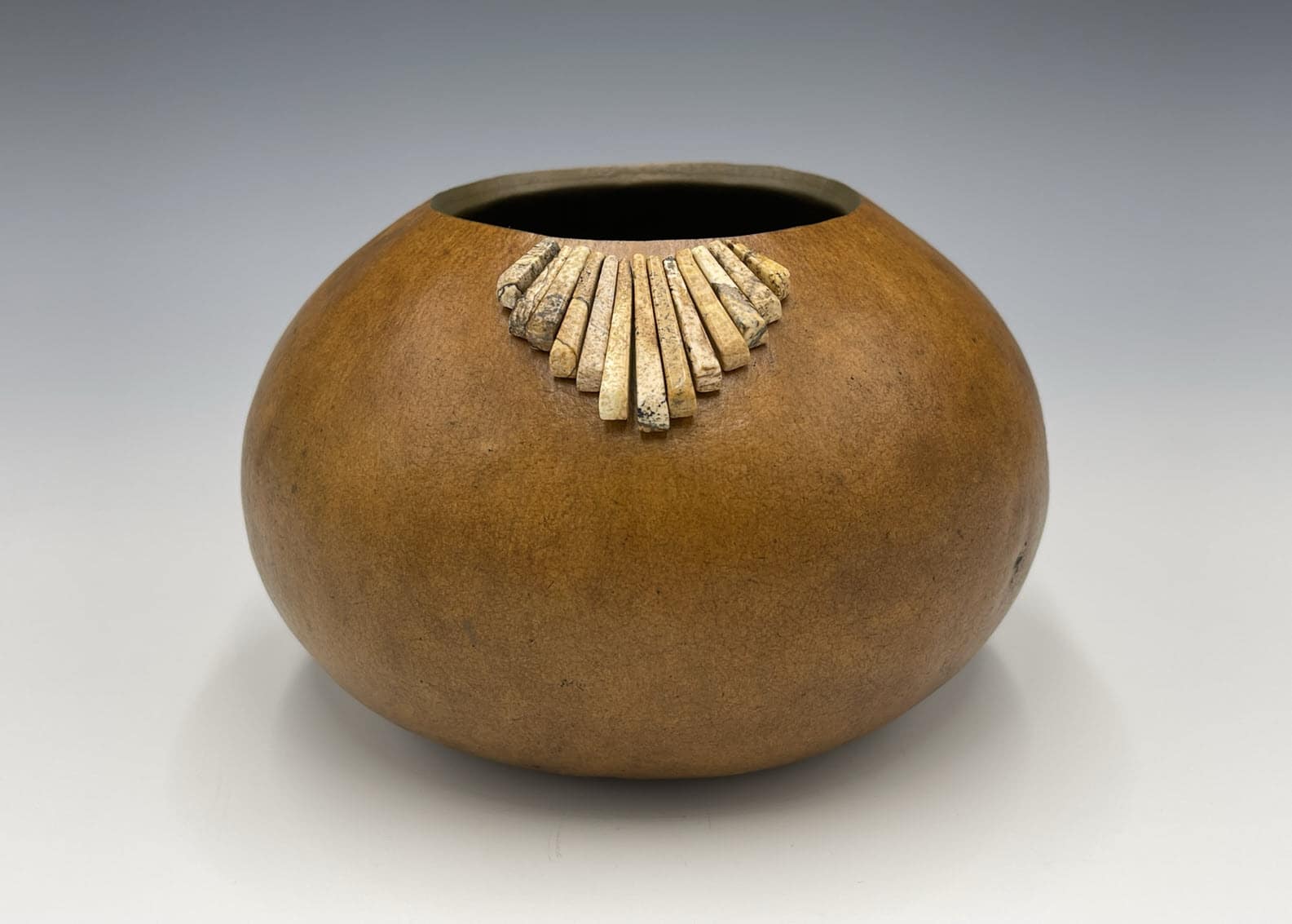 A simple gourd bowl finished with leather dye and embellished with stone pendants.