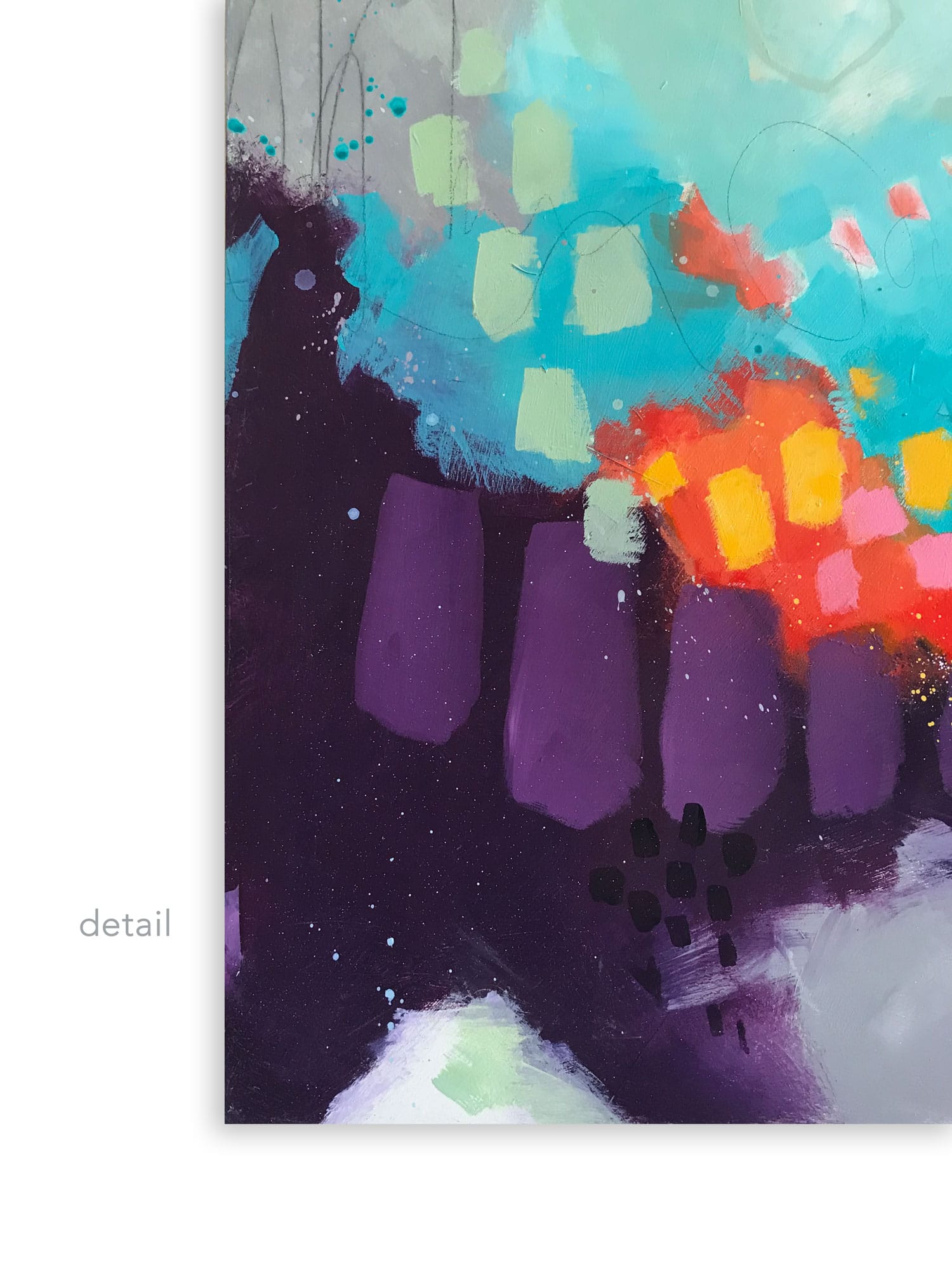 This original acrylic painting, a contemporary modern abstract featuring teal, sage green and a deep purple with bold hints of garden color. Lots of spontaneity, marks, splashes and splatters. I was thinking of a garden of color as I painted it, though it could simply be thought of as an abstract of color.